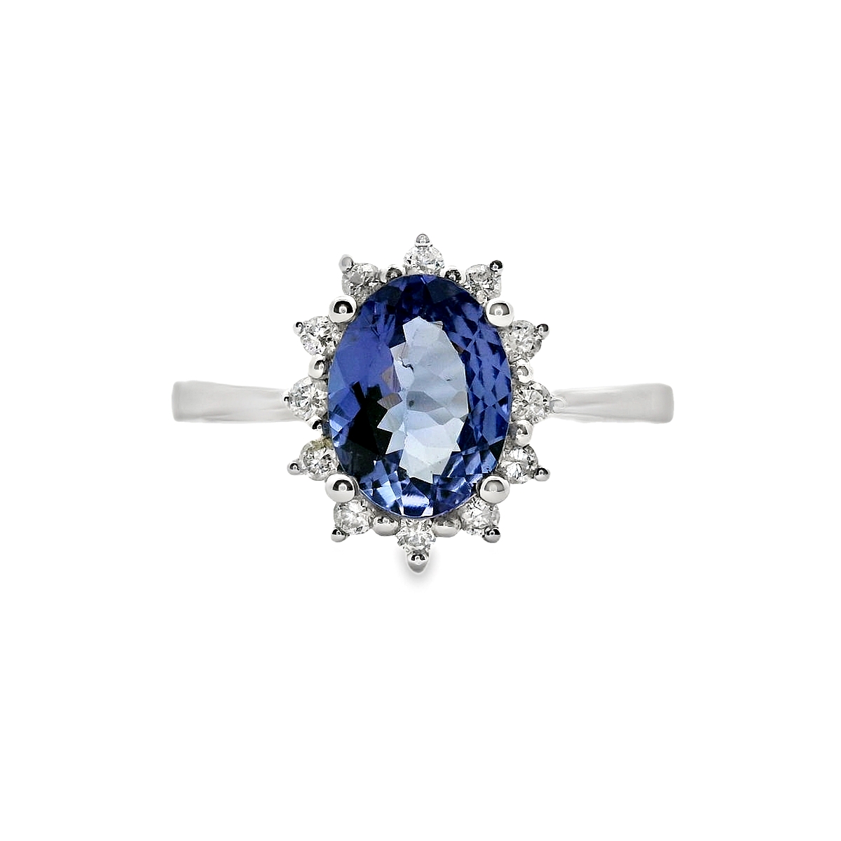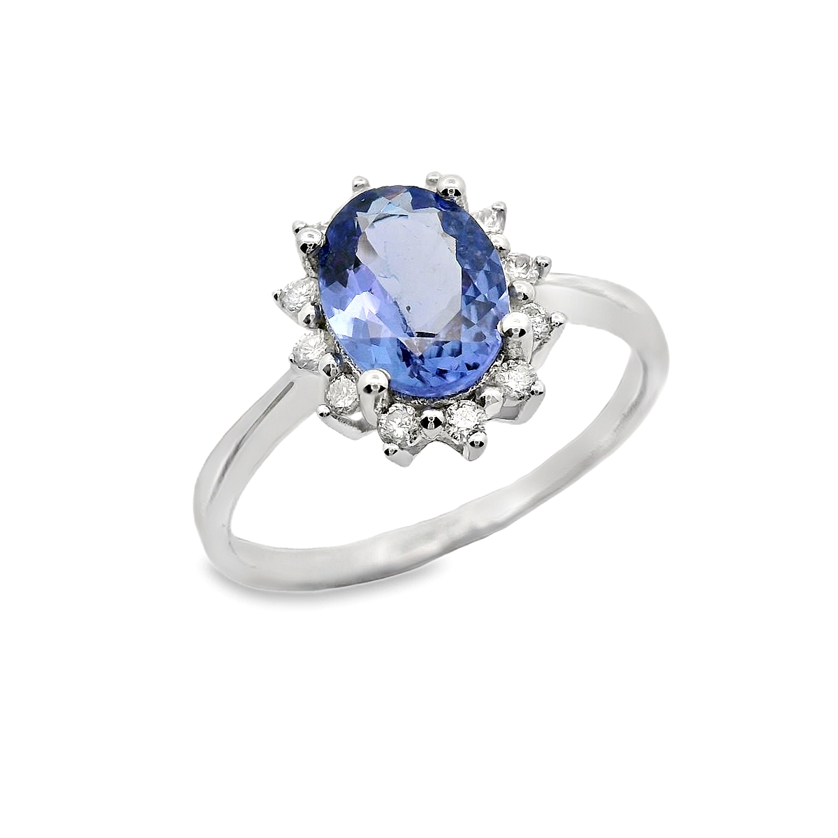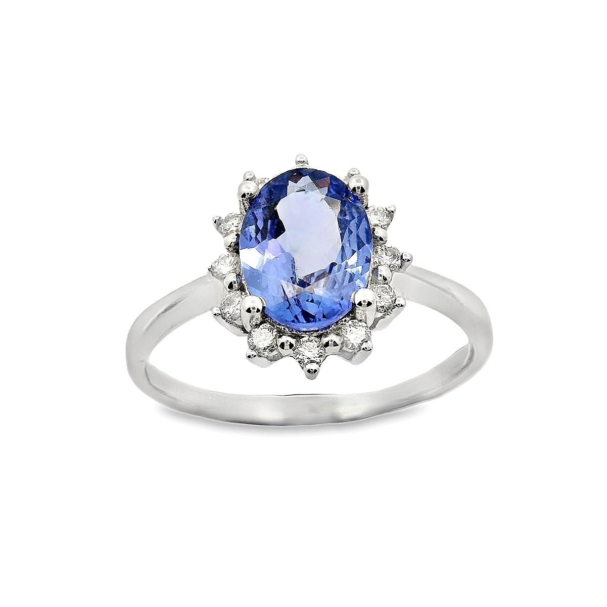 Δακτυλίδι ροζέτα σε λευκό χρυσό 18 καρατίων με Τανζανίτη 0.78ct σε κοπή οβάλ και λευκά διαμάντια περιμετρικά βάρους 0.15ct, χρώματος G και καθαρότητας VS.