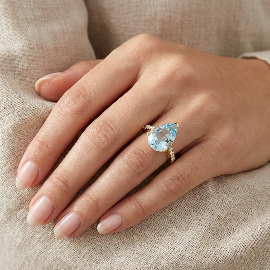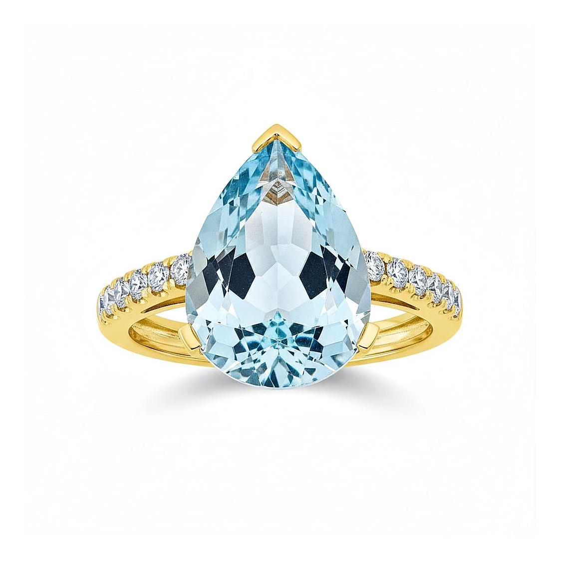 Δακτυλίδι σε χρυσό 18 καρατίων με Sky Blue Τοπάζι βάρους 6.70 ct σε εντυπωσιακή κοπή δάκρυ και 10 λαμπερά διαμάντια συνολικού βάρους 0.23ct, τοποθετημένα κομψά στη γάμπα του δαχτυλιδιού.