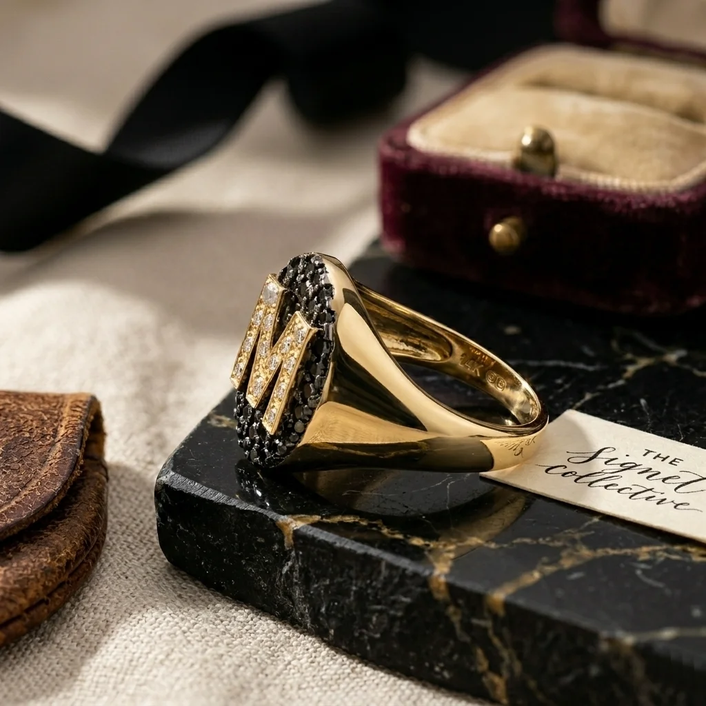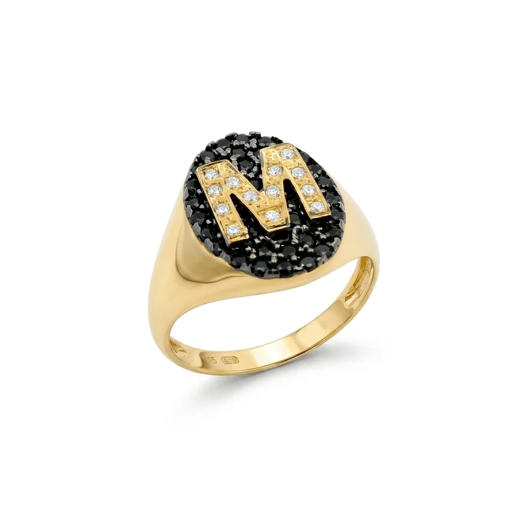 Δακτυλίδι Μονόγραμμα Μ σε χρυσό 14 καρατίων με λευκές και μαύρες πέτρες ζιργκόν. Μπορεί να γίνει παραγγελία με το δικό σας αρχικό γράμμα!