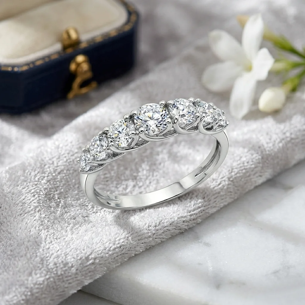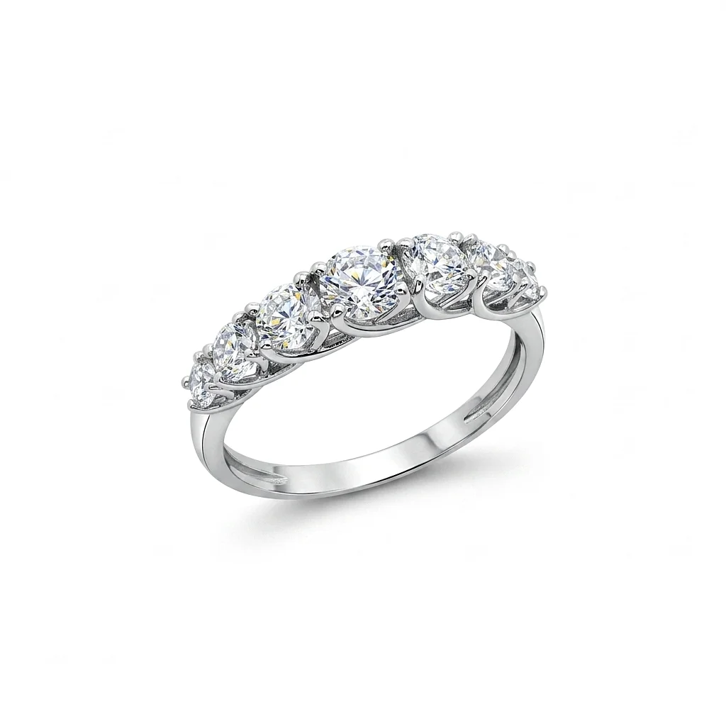 Εντυπωσιακό σειρέ δαχτυλίδι κατασκευασμένο από λευκόχρυσό 14 καρατίων. Το σχέδιο κοσμείται από 7 λαμπερές πέτρες ζιργκόν, τοποθετημένες σε σειρά που καλύπτει το πάνω μέρος του δαχτύλου, προσφέροντας εξαιρετική λάμψη από κάθε γωνία. Ιδανικό για να φορεθεί μόνο του ή σε συνδυασμό με άλλα δαχτυλίδια.