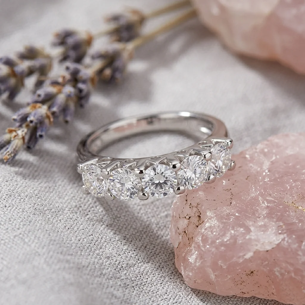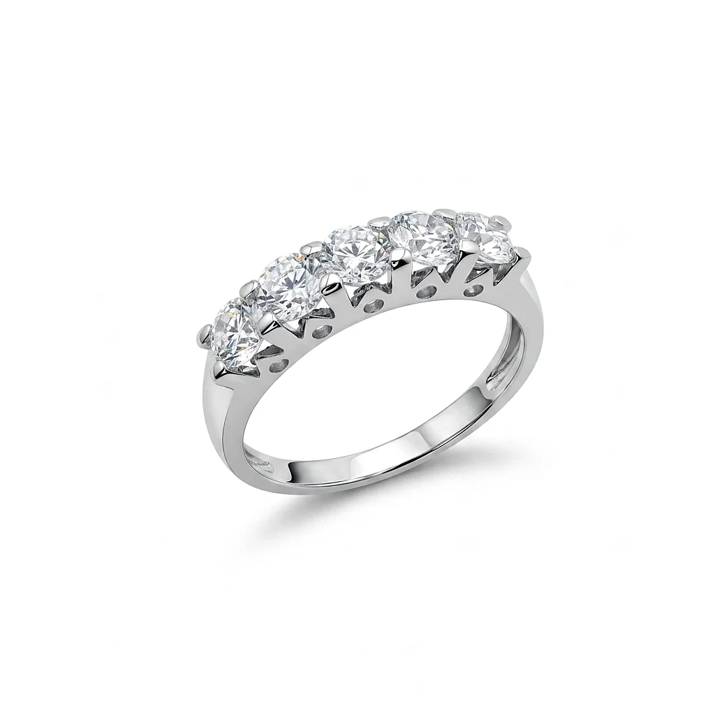 Ένα κόσμημα που μαγνητίζει τα βλέμματα. Αυτό το σειρέ δαχτυλίδι από λευκόχρυσο 14 καρατίων διακρίνεται για την πολυτελή κατασκευή του, προσφέροντας μια αίσθηση σιγουριάς και ποιότητας στο χέρι. Διαθέτει πέντε λαμπερές πέτρες ζιργκόν κορυφαίας καθαρότητας, τοποθετημένες σε εντυπωσιακά καστόνια που αναδεικνύουν το μέγεθός τους.
