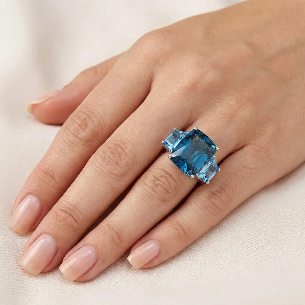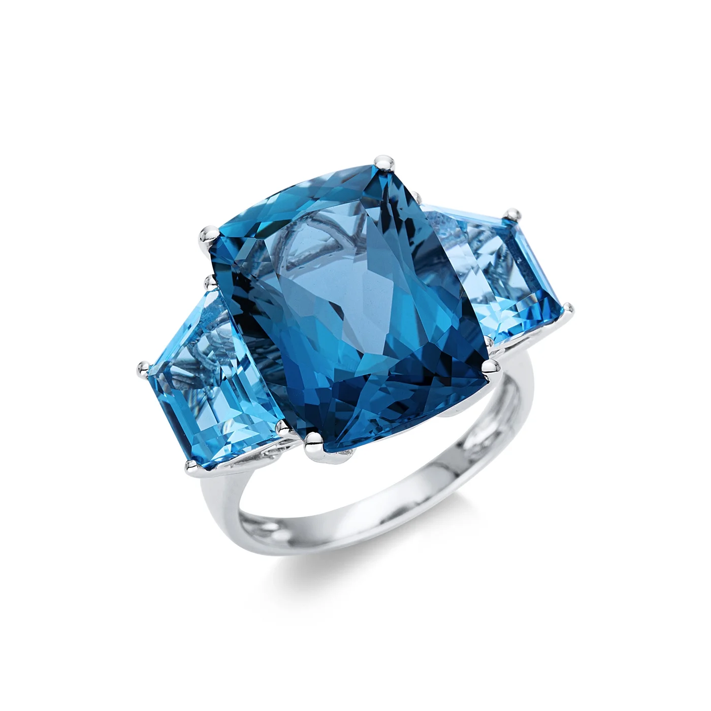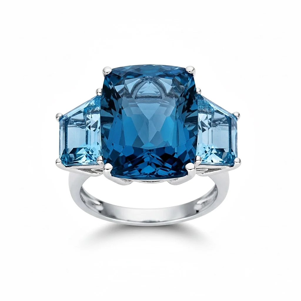 Δακτυλίδι σε λευκόχρυσο 18 καρατίων με London Blue Τοπάζι σε κοπή cushion βάρους 13.80ct και 2 μπλε τοπάζια συνολικού βάρους 4.70ct.