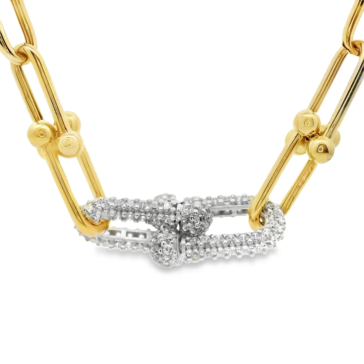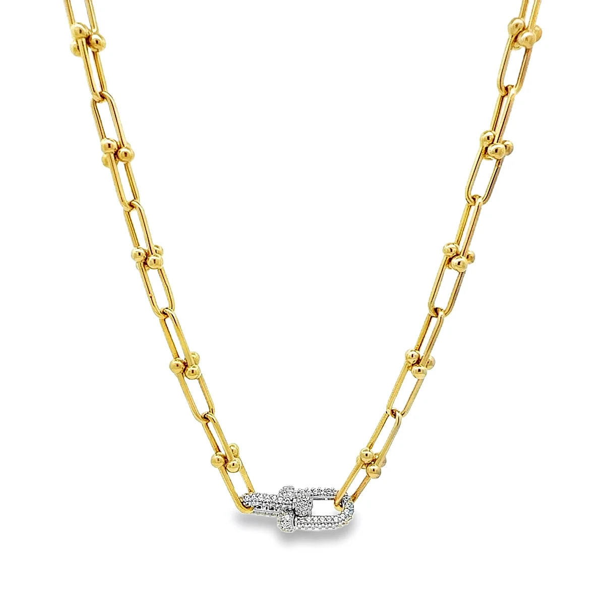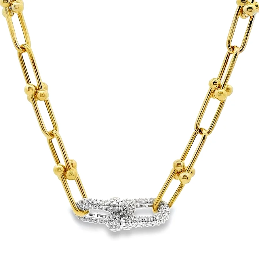 Αναβαθμίστε το στυλ σας με αυτό το εκλεπτυσμένο κολιέ, έναν τέλειο συνδυασμό μοντέρνας κομψότητας και διαχρονικής αίγλης. Είναι κατασκευασμένο από λαμπερό χρυσό 14 καρατίων για μια πλούσια, διαρκή λάμψη. Το κεντρικό του κομμάτι είναι ένα κομψό μοτίφ στολισμένο με αστραφτεράζιργκόν, προσδίδοντας την πολυτελή λάμψη των διαμαντιών. Η τολμηρή, σύγχρονη αλυσίδα-σύνδεσμος κάθεται υπέροχα στο ντεκολτέ, καθιστώντας το ένα ευέλικτο κόσμημα ιδανικό για να προσθέσετε μια πινελιά κομψότητας τόσο στην καθημερινή σας εμφάνιση όσο και σε ειδικές περιστάσεις!