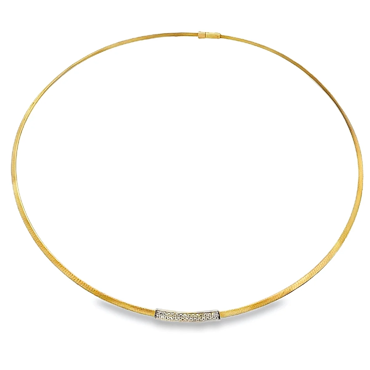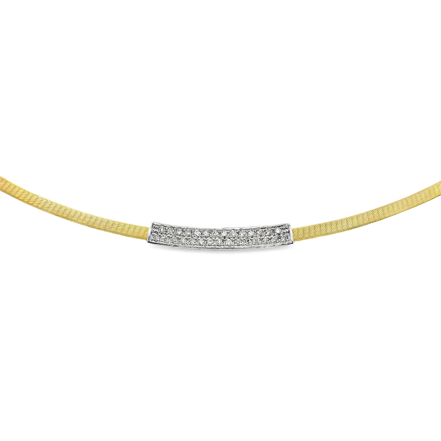 Κολιέ χειροποίητο σε ματ χρυσό 18 καρατίων και λευκόχρυσο μοτίφ διακοσμημένο με λευκά διαμάντια με εξαιρετική λάμψη σε κοπή μπριγιάν συνολικού βάρους 0,15ct χρώματος G και καθαρότητας VS1.