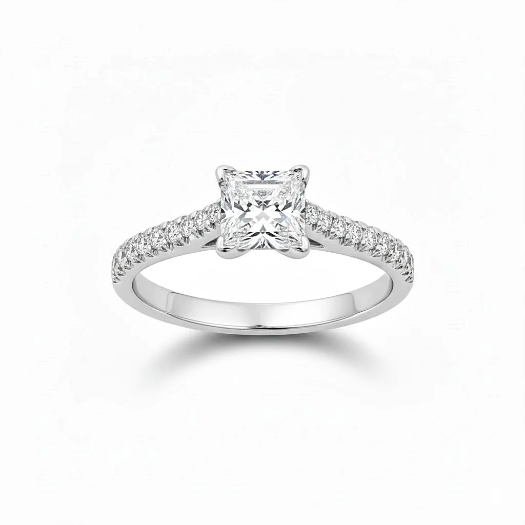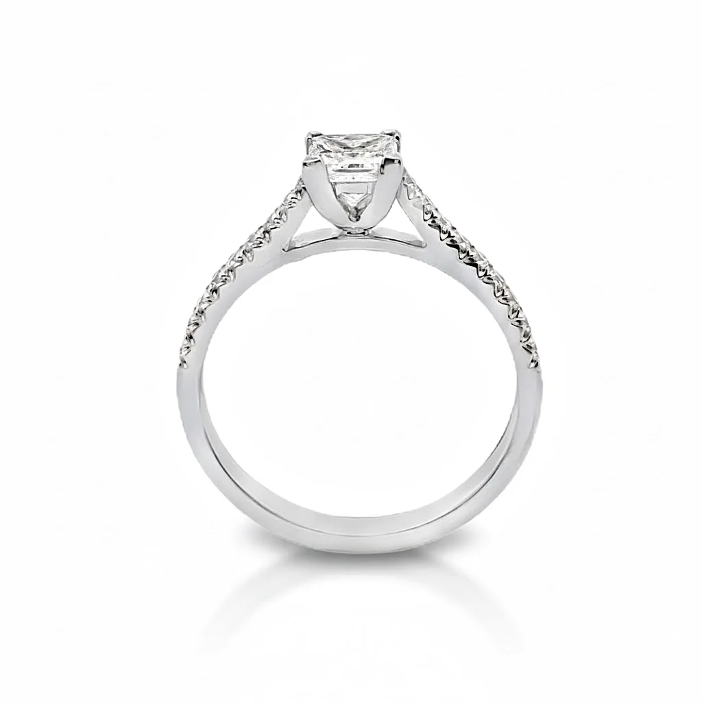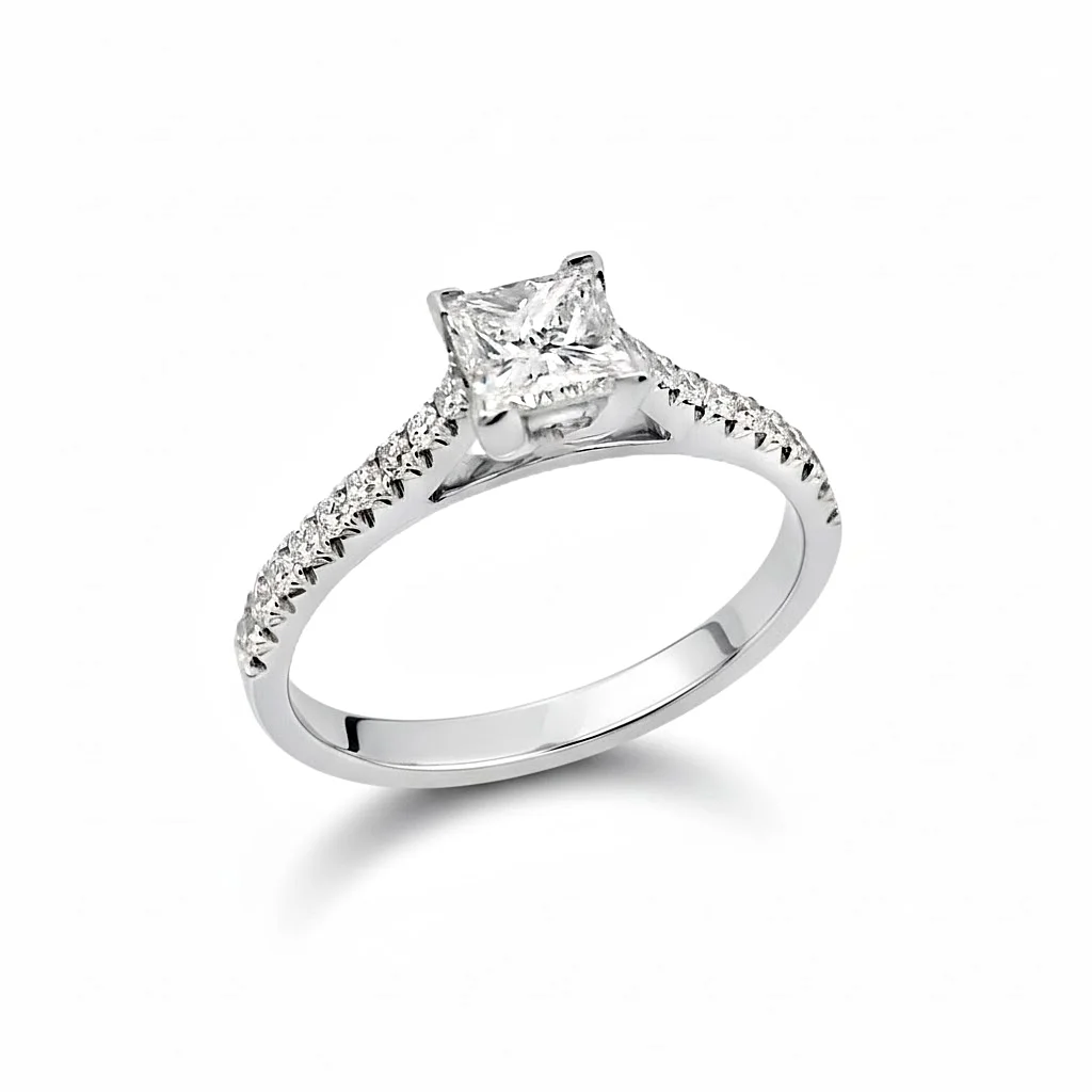 Μονόπετρο δακτυλίδι σε λευκόχρυσο 18 καρατίων με διαμάντι σε κοπή Princess 0,50ct, χρώματος E και καθαρότητας VS2, πιστοποιημένο από το GIA και 18 λευκά διαμάντια σε κοπή μπριγιάν συνολικού βάρους 0,20ct.