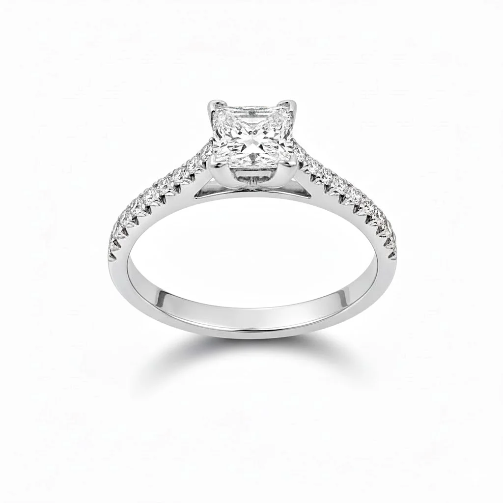 Ένα κόσμημα υψηλής αισθητικής και μοντέρνας πολυτέλειας, σχεδιασμένο για να αιχμαλωτίζει το βλέμμα με τη γεωμετρική του τελειότητα. Κατασκευασμένο από λευκό χρυσό 18 καρατίων, αυτό το δαχτυλίδι συνδυάζει την επιβλητικότητα μιας μεγάλης κεντρικής πέτρας με την αδιάκοπη λάμψη των πλαϊνών διαμαντιών. Διαθέτει ένα εκθαμβωτικό διαμάντι σε κοπή Princess βάρους 0,50ct. Η συγκεκριμένη κοπή προσφέρει έναν μοναδικό συνδυασμό μοντέρνων γραμμών και έντονης σπινθηροβολίας. Το κεντρικό διαμάντι διακρίνεται για το σπάνιο χρώμα του E – Exceptional White και την υψηλή του καθαρότητα VS2, εξασφαλίζοντας απόλυτη διαύγεια. Η γάμπα του δαχτυλιδιού είναι στολισμένη με 18 λευκά διαμάντια σε κοπή μπριγιάν, συνολικού βάρους 0,20ct, που πλαισιώνουν ιδανικά την κεντρική πέτρα. Το κεντρικό διαμάντι συγκρατείται από δέσιμο τεσσάρων κλάδων, που προστατεύει τις γωνίες της πέτρας ενώ επιτρέπει στο φως να εισχωρεί και να αναδεικνύει τη λάμψη της. Η πιστοποίηση από το GIA αποτελεί την απόλυτη εγγύηση για τα χαρακτηριστικά και την αξία του κοσμήματός σας. Η κοπή Princess είναι η πλέον δημοφιλής εναλλακτική της στρογγυλής κοπής, προσφέροντας έναν πιο τολμηρό και σύγχρονο χαρακτήρα. Η στιλπνότητα του λευκόχρυσου 18K αναδεικνύει την ψυχρή και καθαρή λάμψη των διαμαντιών.