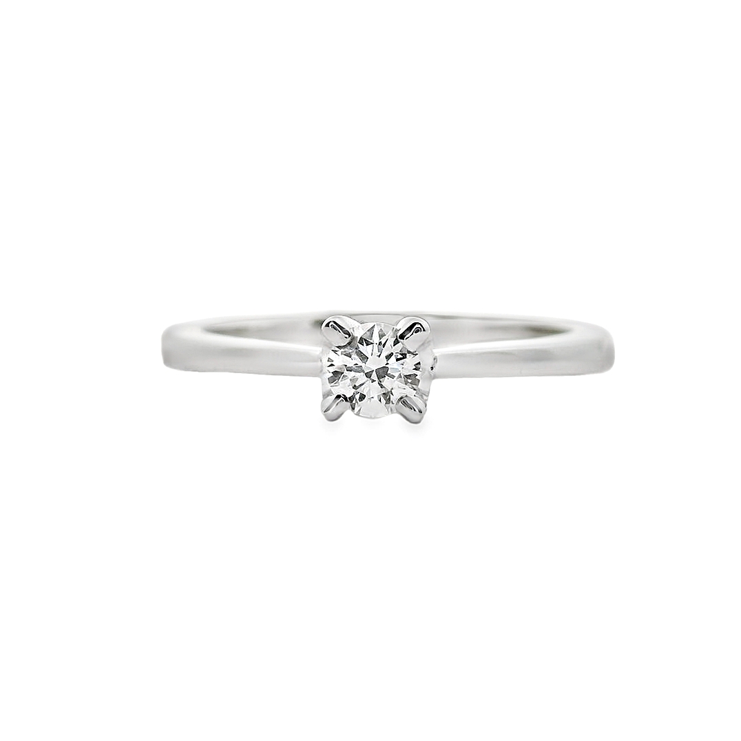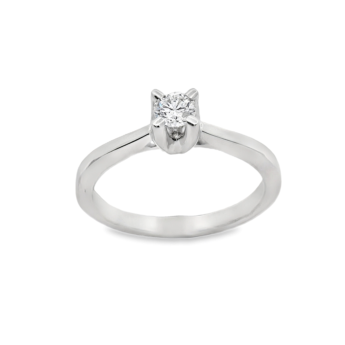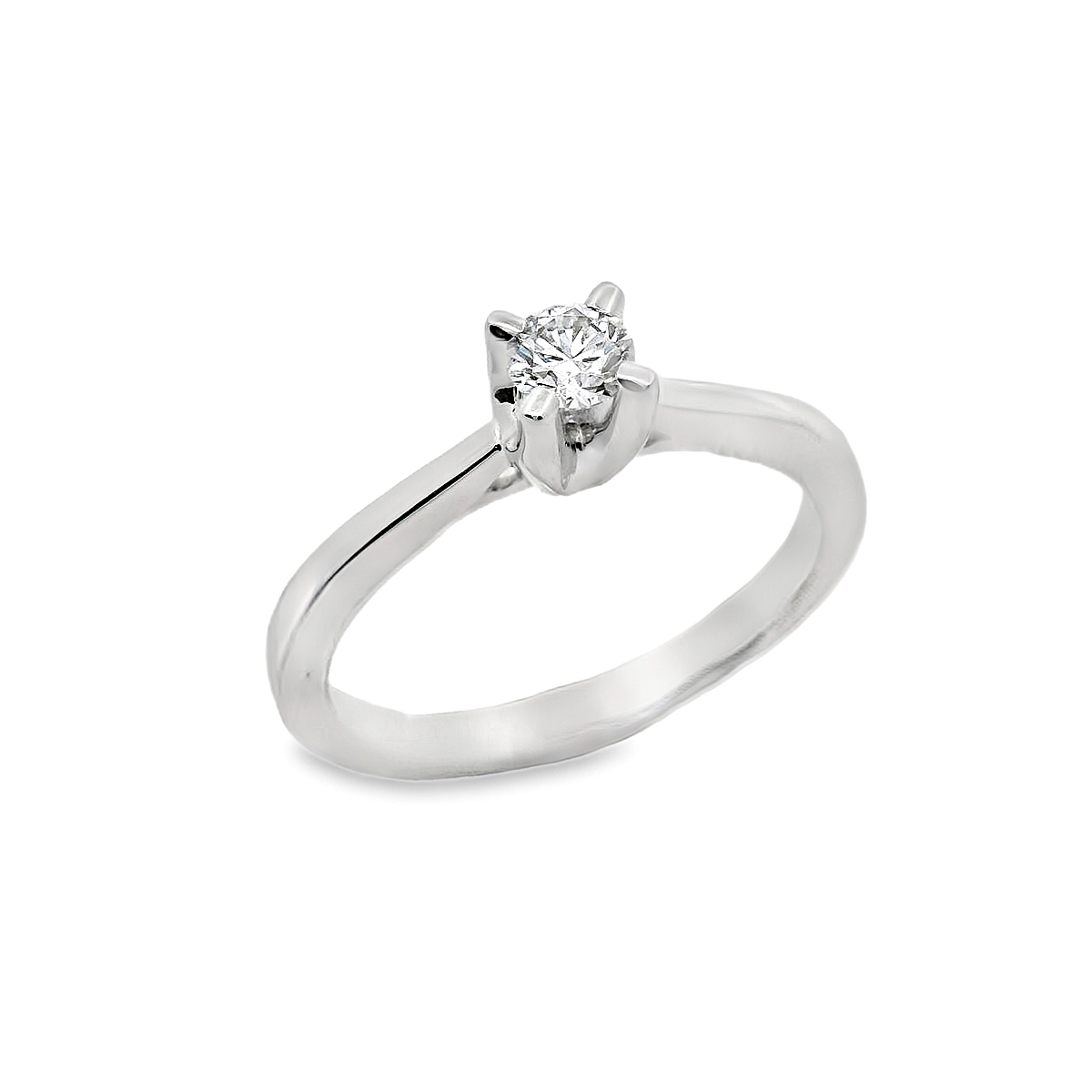 Μονόπετρο δακτυλίδι σε λευκόχρυσο 18 καρατίων με διαμάντι σε κοπή μπριγιάν βάρους 0,18ct, χρώματος E, καθαρότητας VS1 με excellent κοπή, γυάλισμα και συμμετρία, πιστοποιημένο από το GIA.