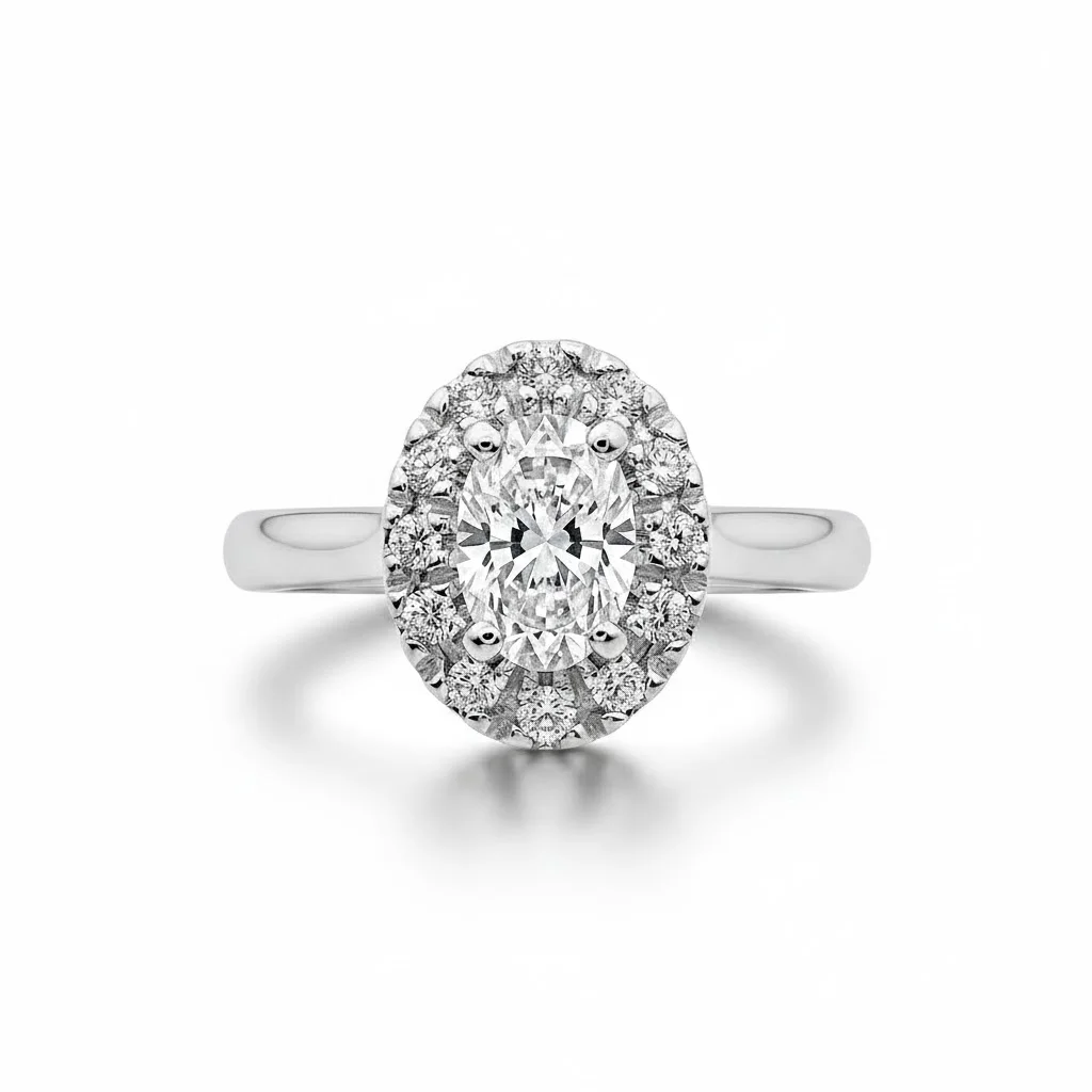 Μονόπετρο δακτυλίδι σε λευκόχρυσο 18 καρατίων με οβάλ διαμάντι 0,50ct, χρώματος D και καθαρότητας VS2, πιστοποιημένο από το GIA και 14 περιμετρικά μπριγιάν συνολικού βάρους 0,21ct χρώματος F και καθαρότητας VS1.