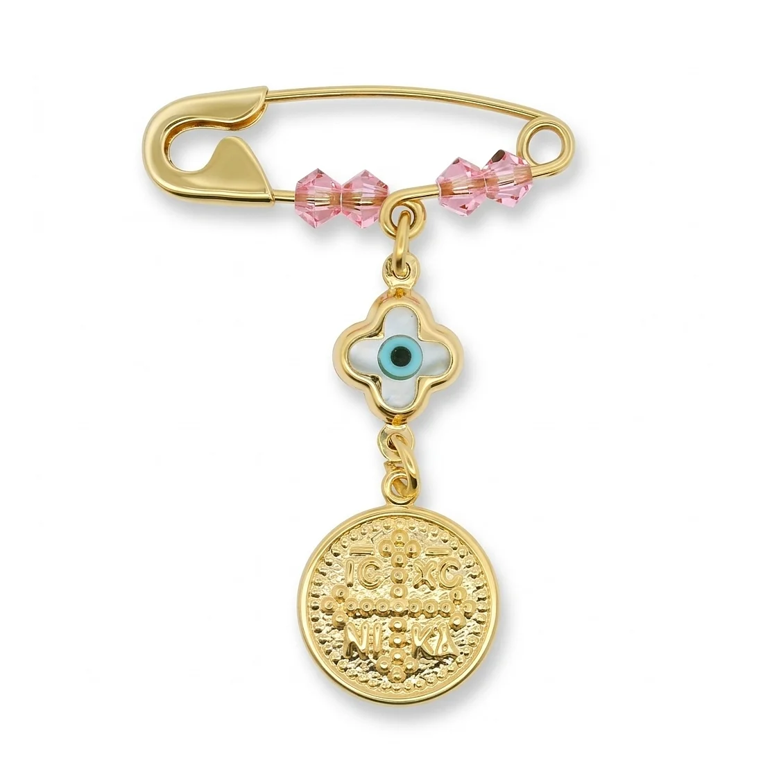Αυτή η χρυσή παιδική παραμάνα αποτελεί ένα παραδοσιακό και πολύτιμο δώρο γέννησης ή βάπτισης. Είναι σχεδιασμένη με έμφαση στη λεπτομέρεια και τον συμβολισμό, συνδυάζοντας την πίστη με την προστασία. Η παραμάνα είναι διακοσμημένη με τέσσερις ροζ κρυστάλλινες πέτρες, που την καθιστούν ιδανική για κορίτσια. Διαθέτει ένα κρεμαστό ματάκι για την αποτροπή της αρνητικής ενέργειας. Στο κάτω μέρος κρέμεται ένα φλουρί Κωνσταντινάτο, ένα κλασικό χριστιανικό σύμβολο ευλογίας και τύχης. Προορίζεται για να τοποθετηθεί στα ρούχα του μωρού, στο καρότσι ή πάνω από την κούνια ως φυλαχτό.