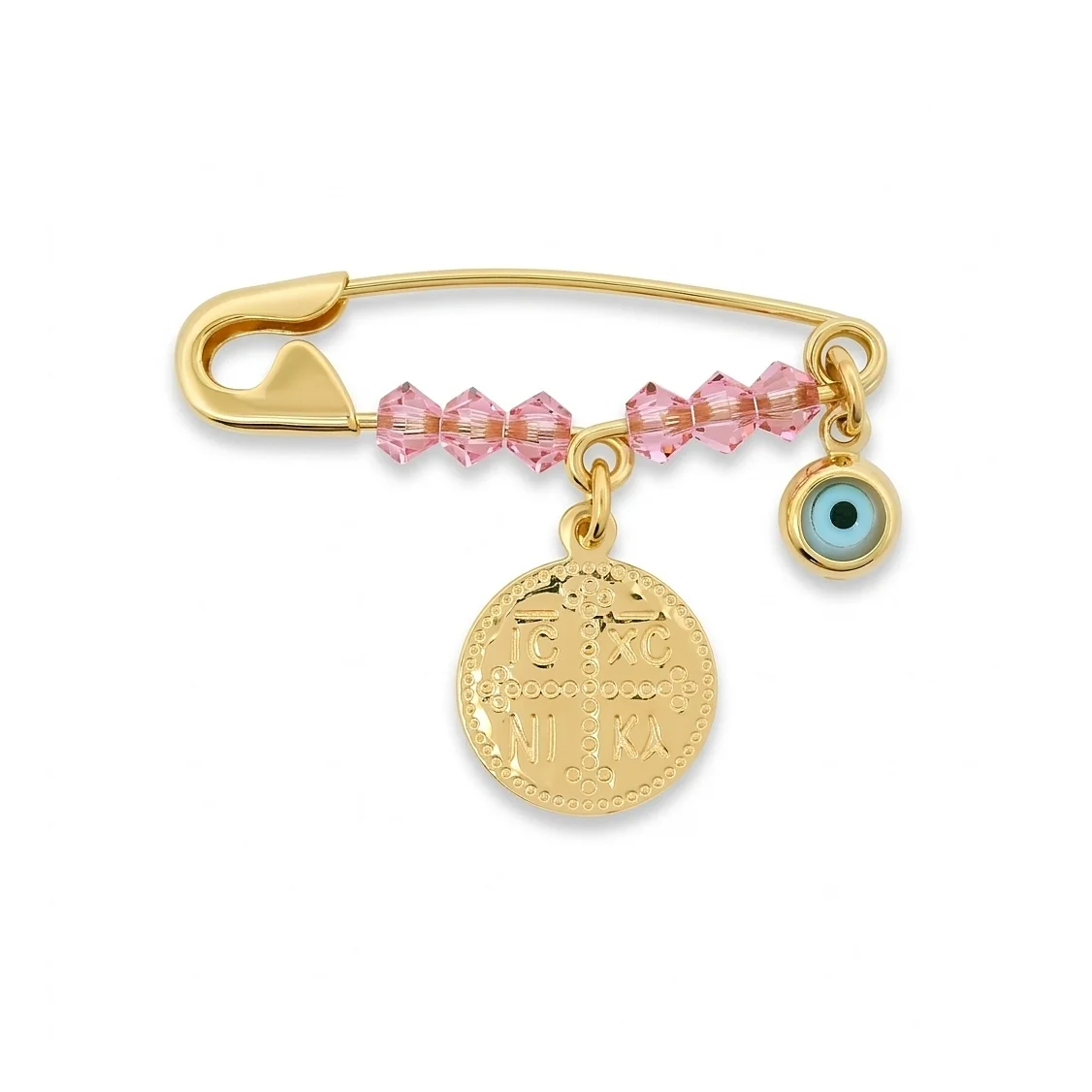 Αυτή η χρυσή παιδική παραμάνα αποτελεί ένα παραδοσιακό και πολύτιμο δώρο γέννησης ή βάπτισης. Είναι σχεδιασμένη με έμφαση στη λεπτομέρεια και τον συμβολισμό, συνδυάζοντας την πίστη με την προστασία. Η παραμάνα είναι διακοσμημένη με τέσσερις ροζ κρυστάλλινες πέτρες, που την καθιστούν ιδανική για κορίτσια. Διαθέτει ένα κρεμαστό ματάκι για την αποτροπή της αρνητικής ενέργειας. Στο κάτω μέρος κρέμεται ένα φλουρί Κωνσταντινάτο, ένα κλασικό χριστιανικό σύμβολο ευλογίας και τύχης. Προορίζεται για να τοποθετηθεί στα ρούχα του μωρού, στο καρότσι ή πάνω από την κούνια ως φυλαχτό.
