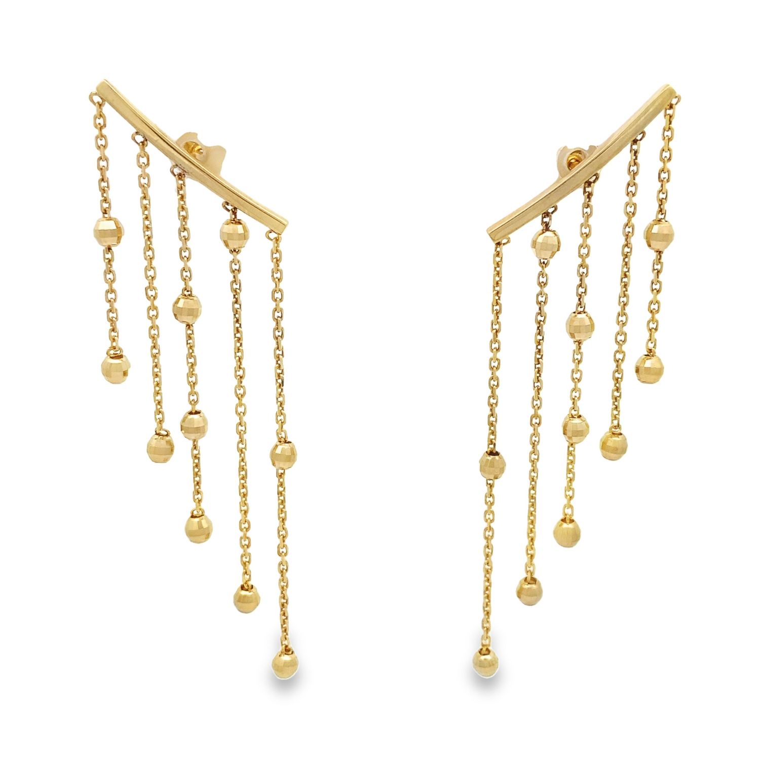 Σκουλαρίκια με κρεμαστά αλυσιδάκια και διαμάνταρισμένες μπίλιες σε κίτρινο χρυσό 14 καρατίων.