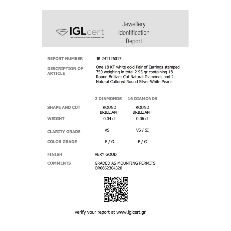 Σκουλαρίκια με λευκά μαργαριτάρια θαλάσσης Akoya Ιαπωνίας διαμέτρου 8-8.5mm χιλιοστών σε σχήμα Full Round (στρόγγυλο) και 18 λευκά διαμάντια σε κοπή μπριγιάν συνολικού βάρους 0.10ct χρώματος F/G και καθαρότητας VS/SI σε λευκόχρυσo 18 καρατίων. Συνοδεύονται με πιστοποιητικό του γεμμολογικού ινστιτούτου IGL.