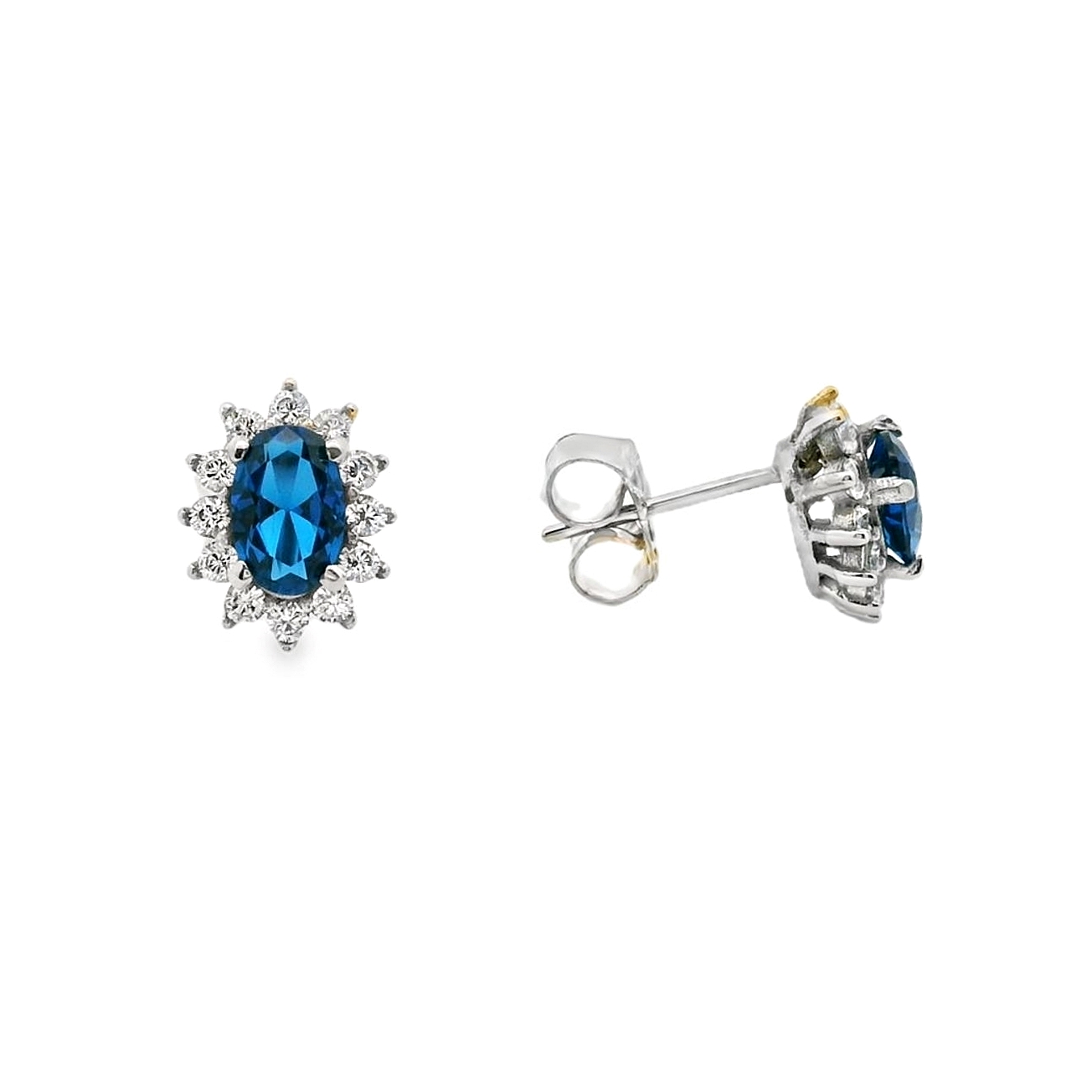 Σκουλαρίκια ροζέτα σε λευκόχρυσο 14 καρατίων με λευκά και μπλε ζιργκόν.