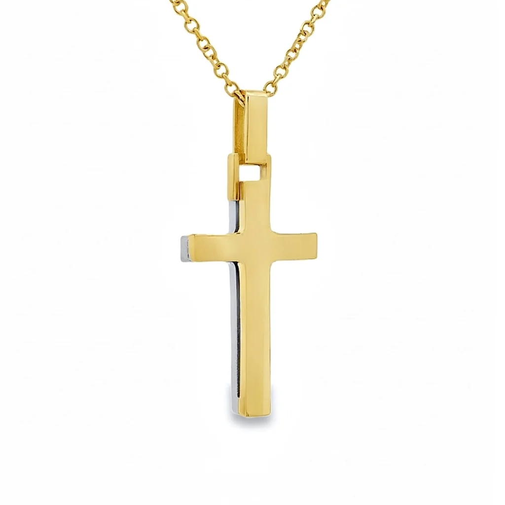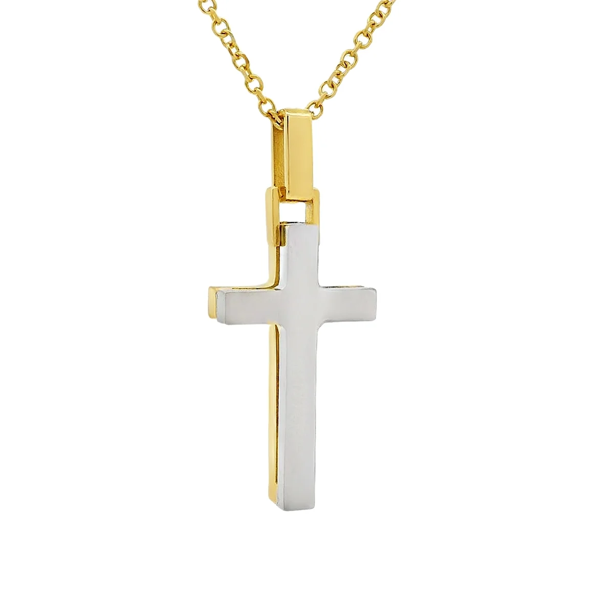 Σταυρός ανδρικός διπλής όψης σε κίτρινο και λευκό χρυσό 14 καράτια. Η αλυσίδα πωλείται χωριστά.