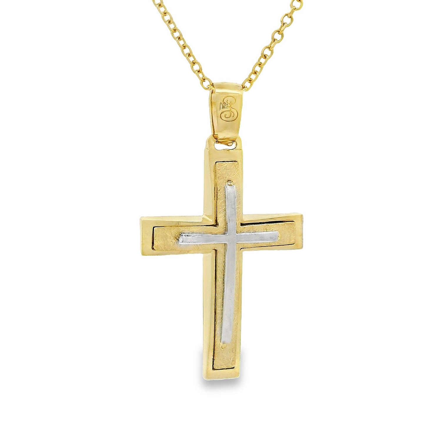 Σταυρός ανδρικός δίχρωμος σε λευκό και κίτρινο χρυσό 14 καράτια. Η αλυσίδα πωλείται χωριστά.