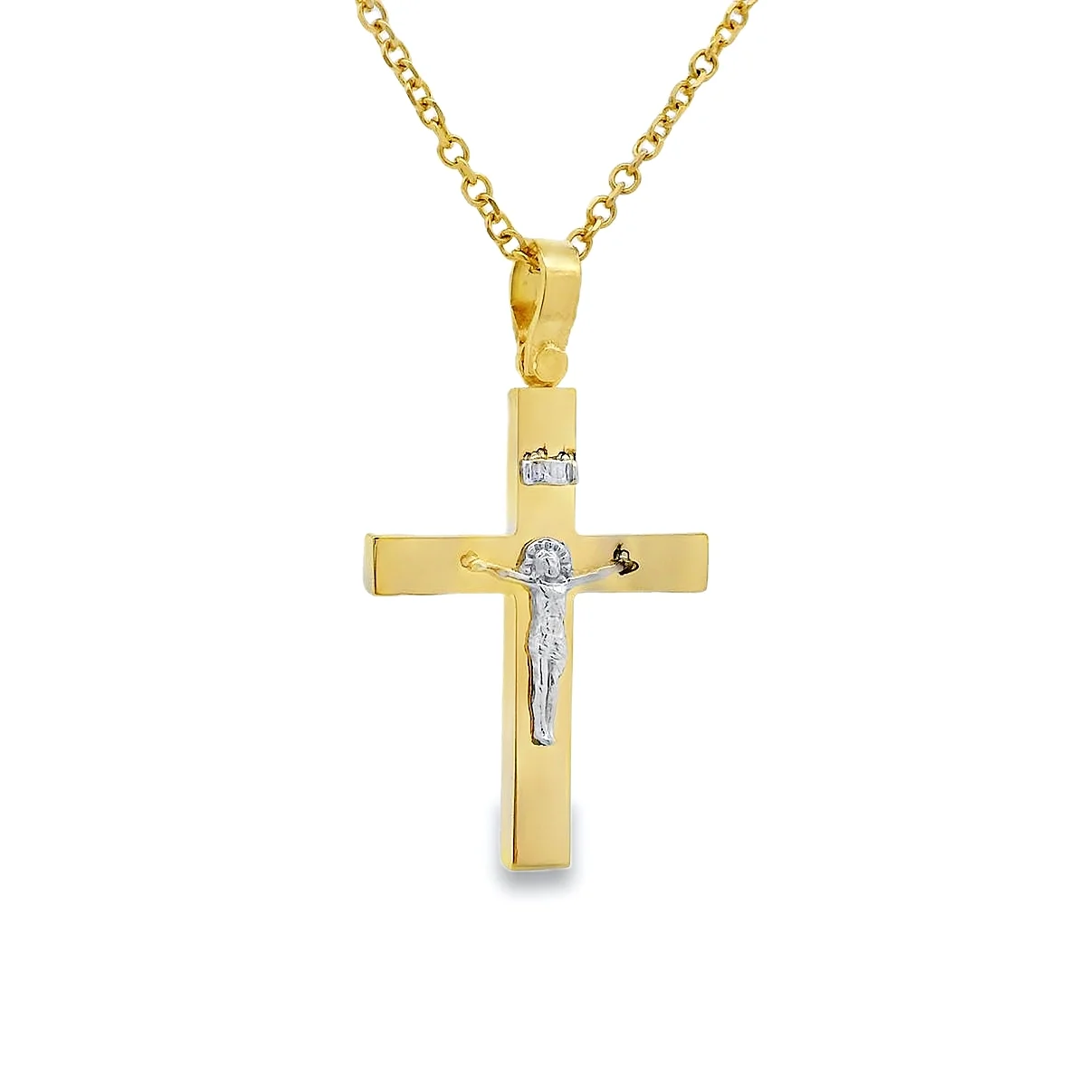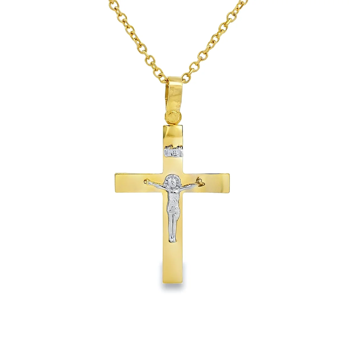 Σταυρός ανδρικός με τον Εσταυρωμένο σε κίτρινο και λευκό χρυσό 14 καράτια. Η αλυσίδα πωλείται χωριστά.