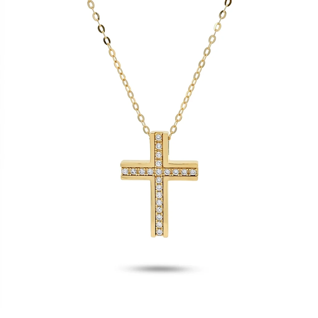 Γυναικείος σταυρός σε κίτρινο χρυσό 9 καράτια με πέτρες ζιργκόν με αλυσίδα 42cm.