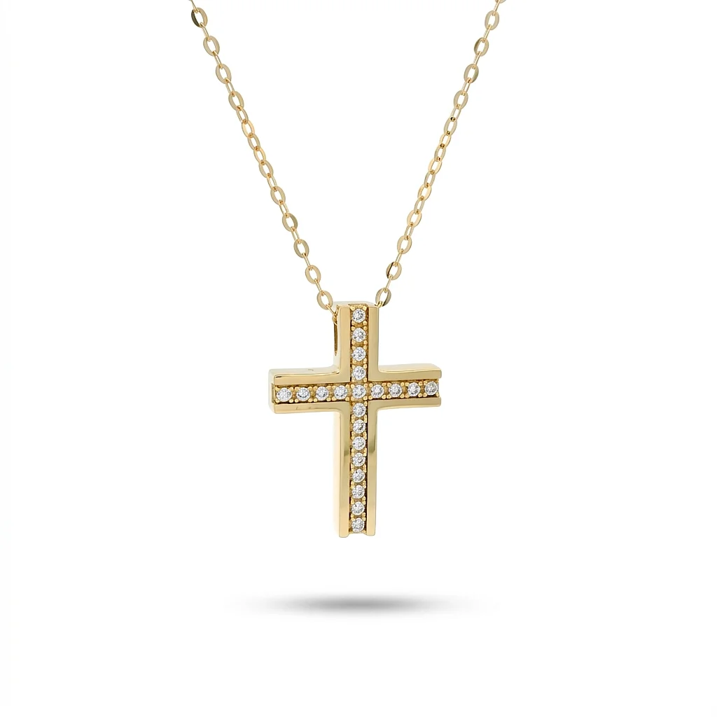 O σταυρός διακρίνεται για τον minimal και γεωμετρικό του σχεδιασμό, ενώ η σειρά από αστραφτερά λευκά ζιργκόν του χαρίζει μια διαρκή φωτεινότητα. Λόγω του κομψού του μεγέθους και του χαμηλού του βάρους, είναι ιδανικός για να φοριέται καθημερινά χωρίς να ενοχλεί. Αποτελεί μια εξαιρετική επιλογή για δώρο γενεθλίων, ονομαστικής εορτής ή ακόμα και για μια διακριτική βάπτιση.