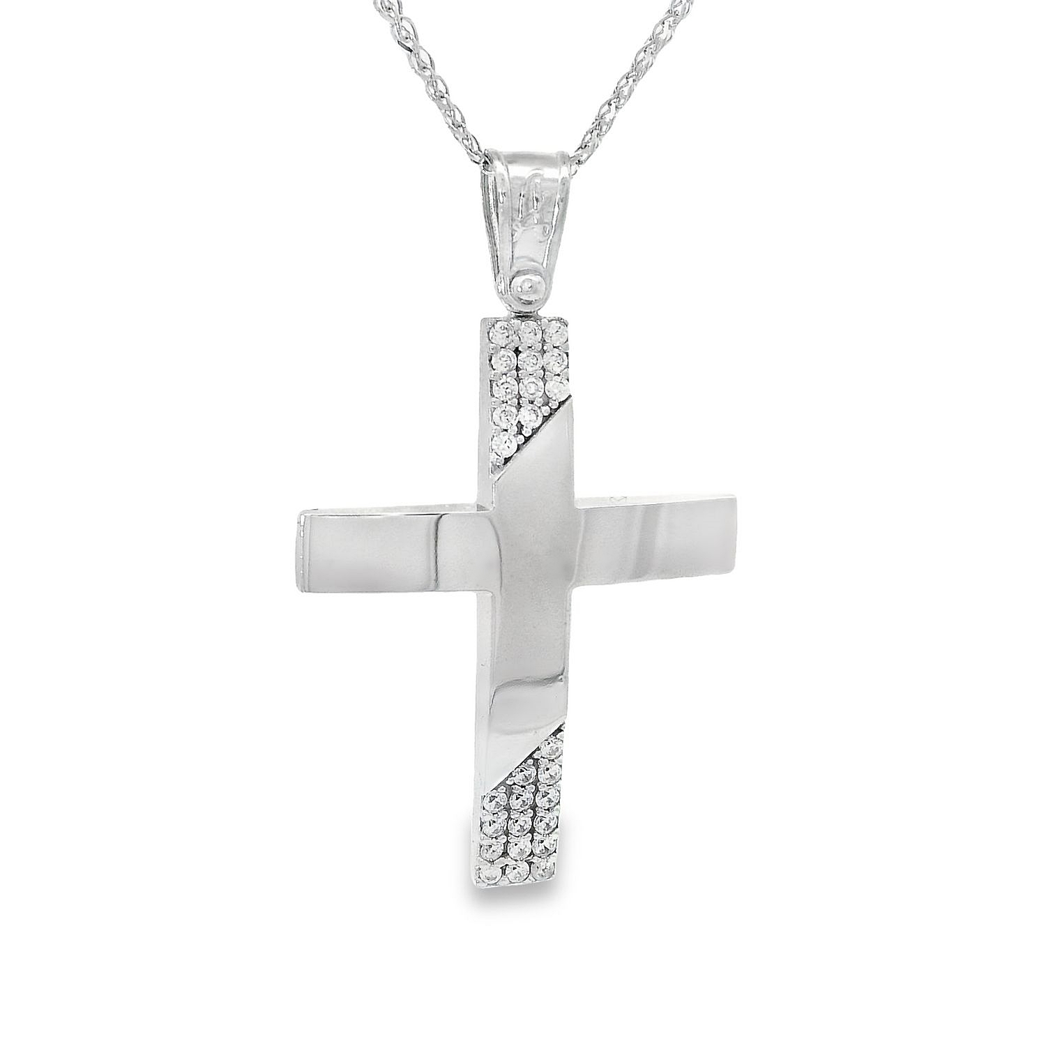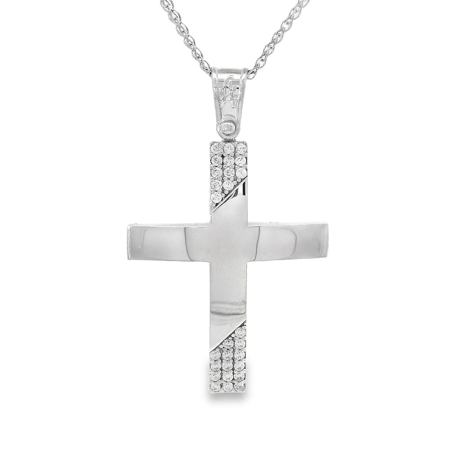 Γυναικείος σταυρός σε λευκόχρυσο 14 καράτια με πέτρες ζιργκόν. Η αλυσίδα πωλείται χωριστά.