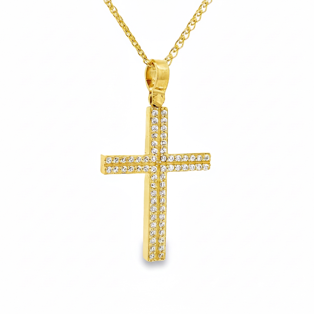Γυναικείος σταυρός σε κίτρινο χρυσο 14 καράτια με πέτρες ζιργκόν. Η αλυσίδα πωλείται χωριστά.