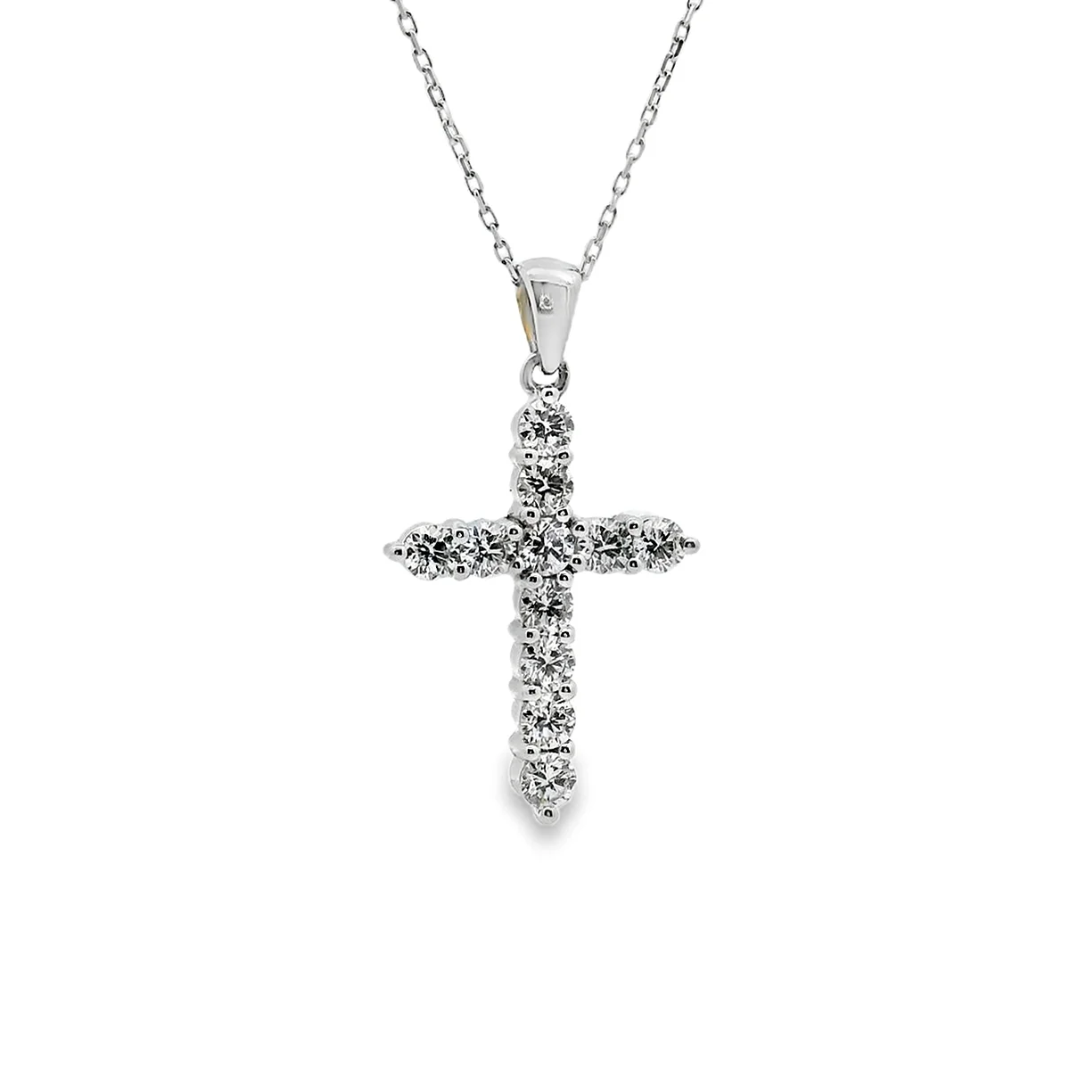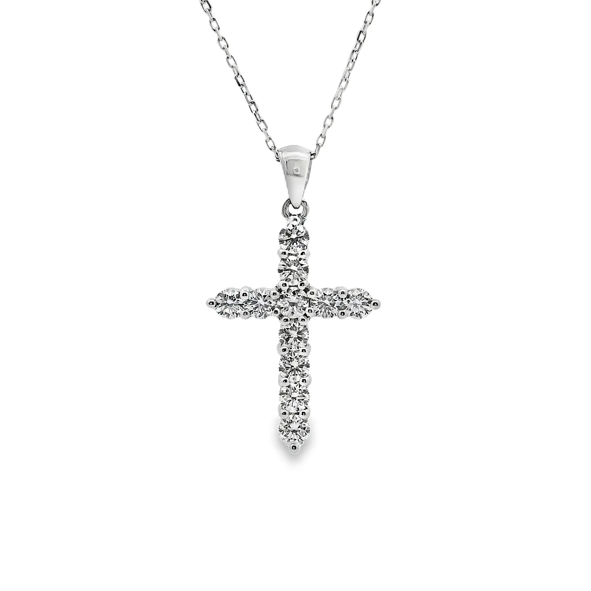 Γυναικείος σταυρός σε λευκόχρυσo 18 καράτια με λευκά διαμάντια σε κοπή μπριγιάν συνολικού βάρους 0,78ct, χρώματος G και καθαρότητας VS. Μήκος αλυσίδας 40cm.