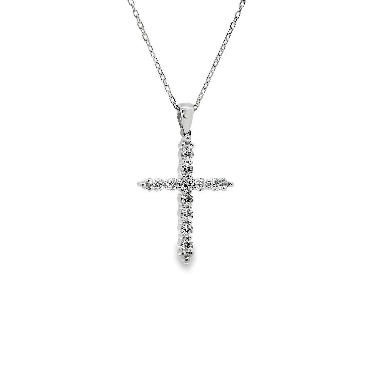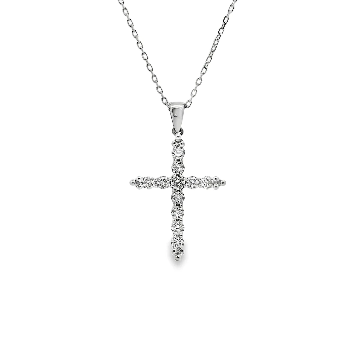 Γυναικείος σταυρός σε λευκόχρυσo 18 καράτια με λευκά διαμάντια σε κοπή μπριγιάν συνολικού βάρους 0,27ct, χρώματος G και καθαρότητας VS. Μήκος αλυσίδας 40cm.