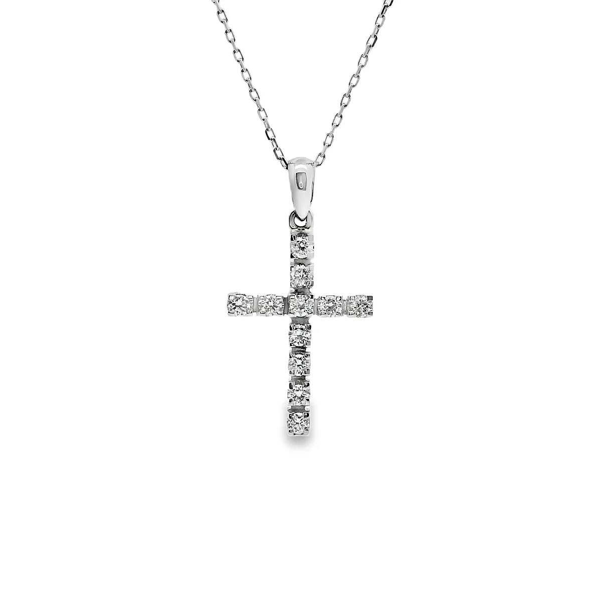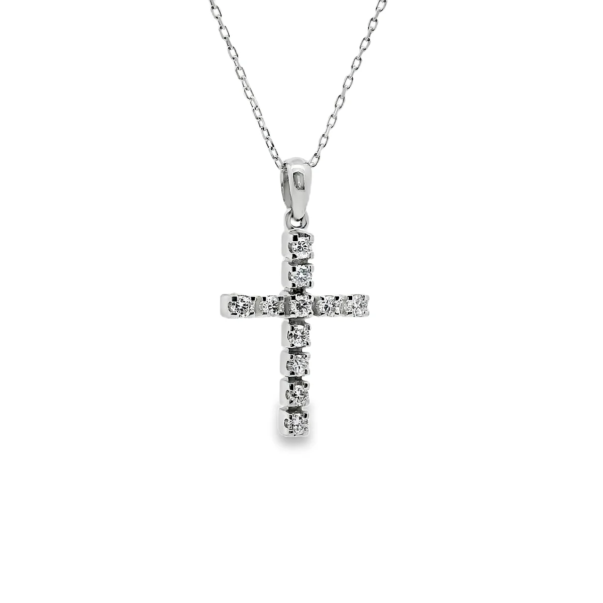 Γυναικείος σταυρός σε λευκόχρυσo 18 καράτια με λευκά διαμάντια σε κοπή μπριγιάν συνολικού βάρους 0,25ct, χρώματος G και καθαρότητας VS. Μήκος αλυσίδας 40cm.
