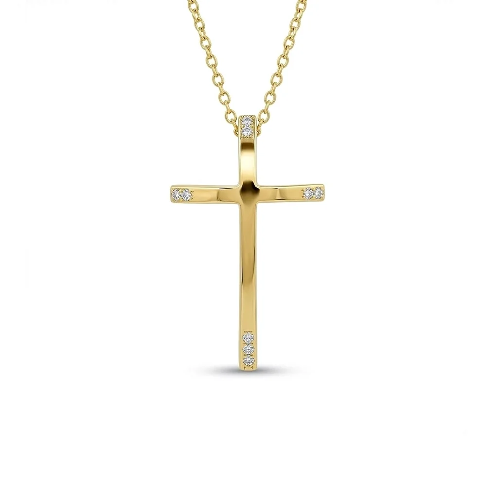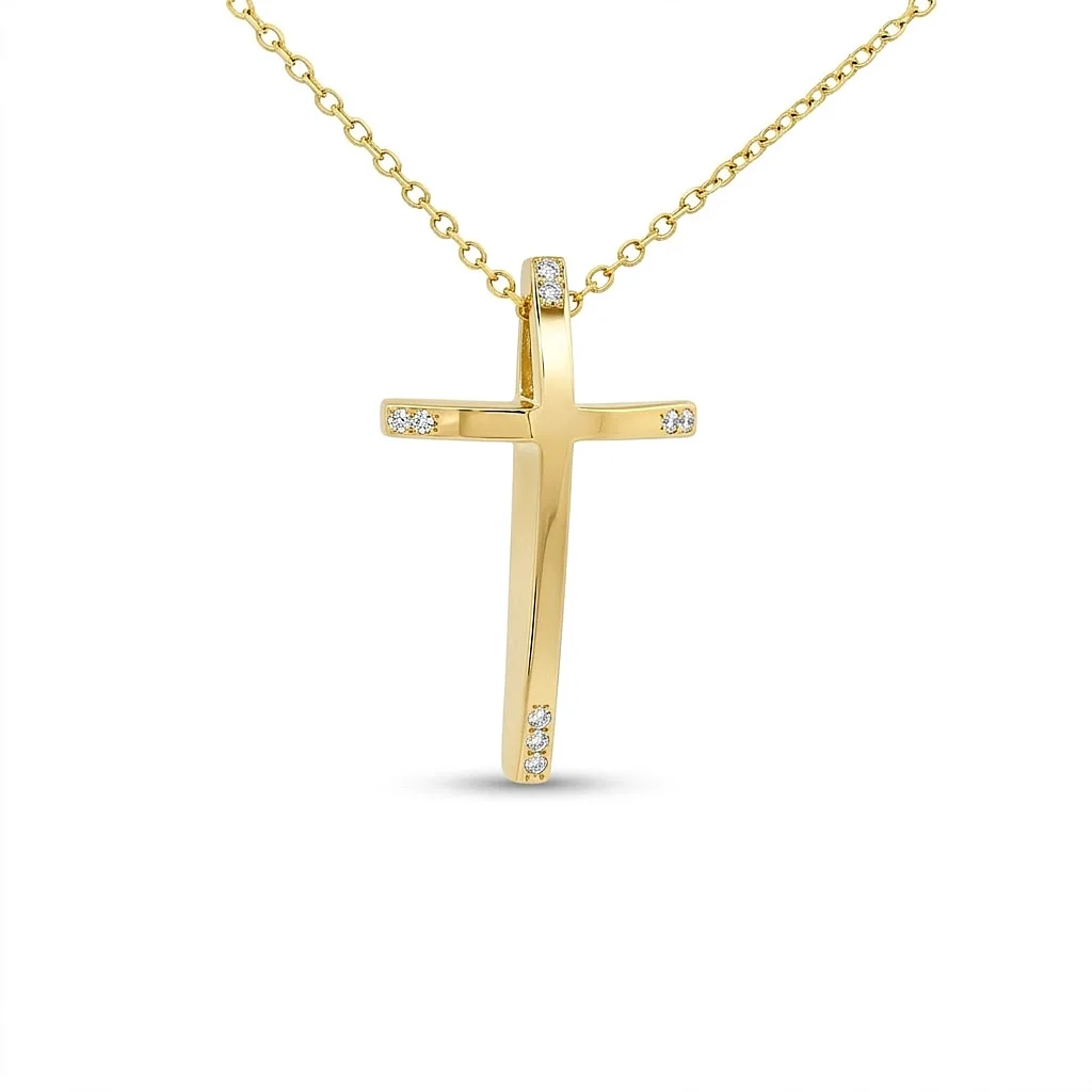 Γυναικείος σταυρός σε κίτρινο χρυσο 14 καράτια με 9 διαμάντια σε κοπή μπριγιάν συνολικού βάρους 0,027ct χρώματος G και καθαρότητας VS1. Η αλυσίδα πωλείται χωριστά.