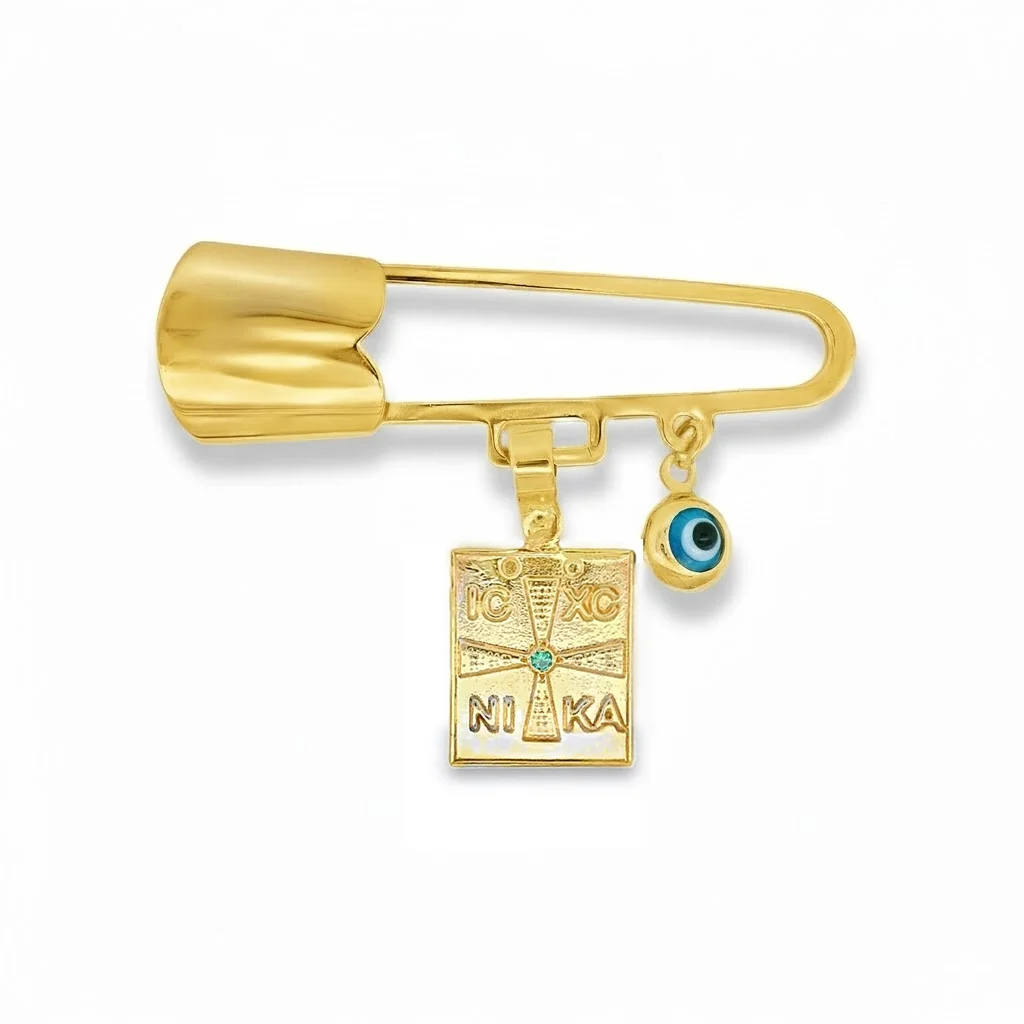 Μια ιερή και προστατευτική παραμάνα, το ιδανικό δώρο για βαπτίσεις και γεννήσεις, γεμάτο συμβολισμό. Είναι κατασκευασμένη από κίτρινο χρυσό 9 καρατίων και διαθέτει δύο κρεμαστά φυλαχτά: Φυλαχτό Κωνσταντινάτο: Ένα τετράγωνο μενταγιόν με την επιγραφή «Ιησούς Χριστός Νικά», ένα ισχυρό σύμβολο της Ορθοδοξίας. Το κέντρο του σταυρού είναι διακοσμημένο με ένα μικρό τυρκουάζ πετράδι. Ματάκι: Ένα μικρό στρογγυλό ματάκι, κλασικό ελληνικό σύμβολο προστασίας από το κακό μάτι. Η παραμάνα κλείνει με ασφάλεια και προσαρμόζεται εύκολα στα ρουχαλάκια ή την κουβέρτα του μωρού, προσφέροντας διπλή προστασία. Ένα πολύτιμο δώρο γεμάτο ευχές και προστασία!
