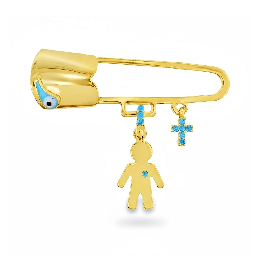 Φυλαχτό παραμάνα παιδική με σταυρό, ματάκι και αγοράκι σε χρυσό 9 καρατίων και γαλάζια ζιργκόν.