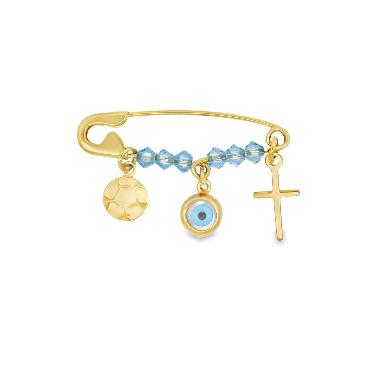 Φυλαχτό παραμάνα παιδική με σταυρό, ματάκι, μπάλα και γαλάζιους κρυστάλλους σε χρυσό 9 καρατίων.
