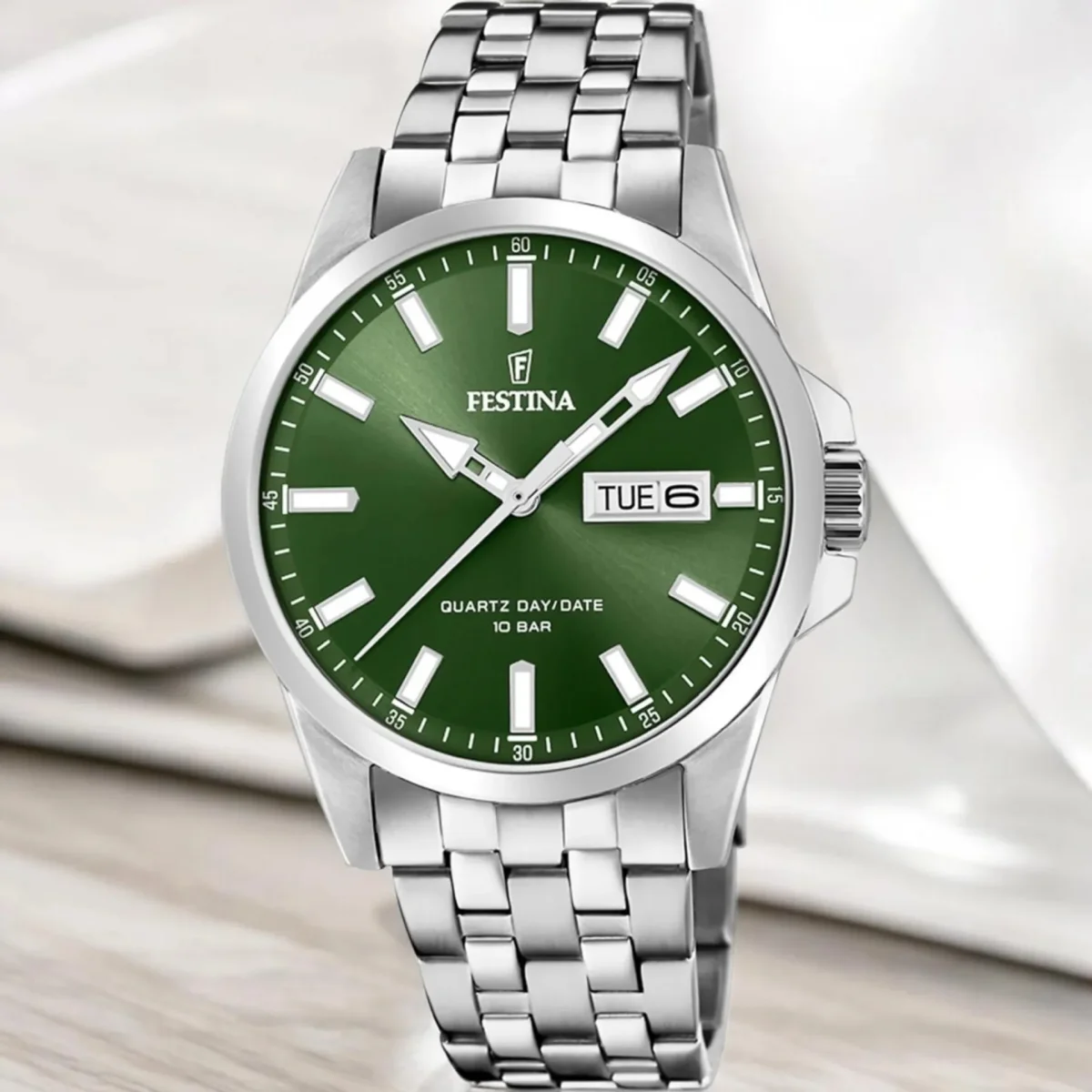 Ανδρικό ρολόι Festina από ανοξείδωτο ατσάλι με πράσινο καντράν και μπρασελέ.