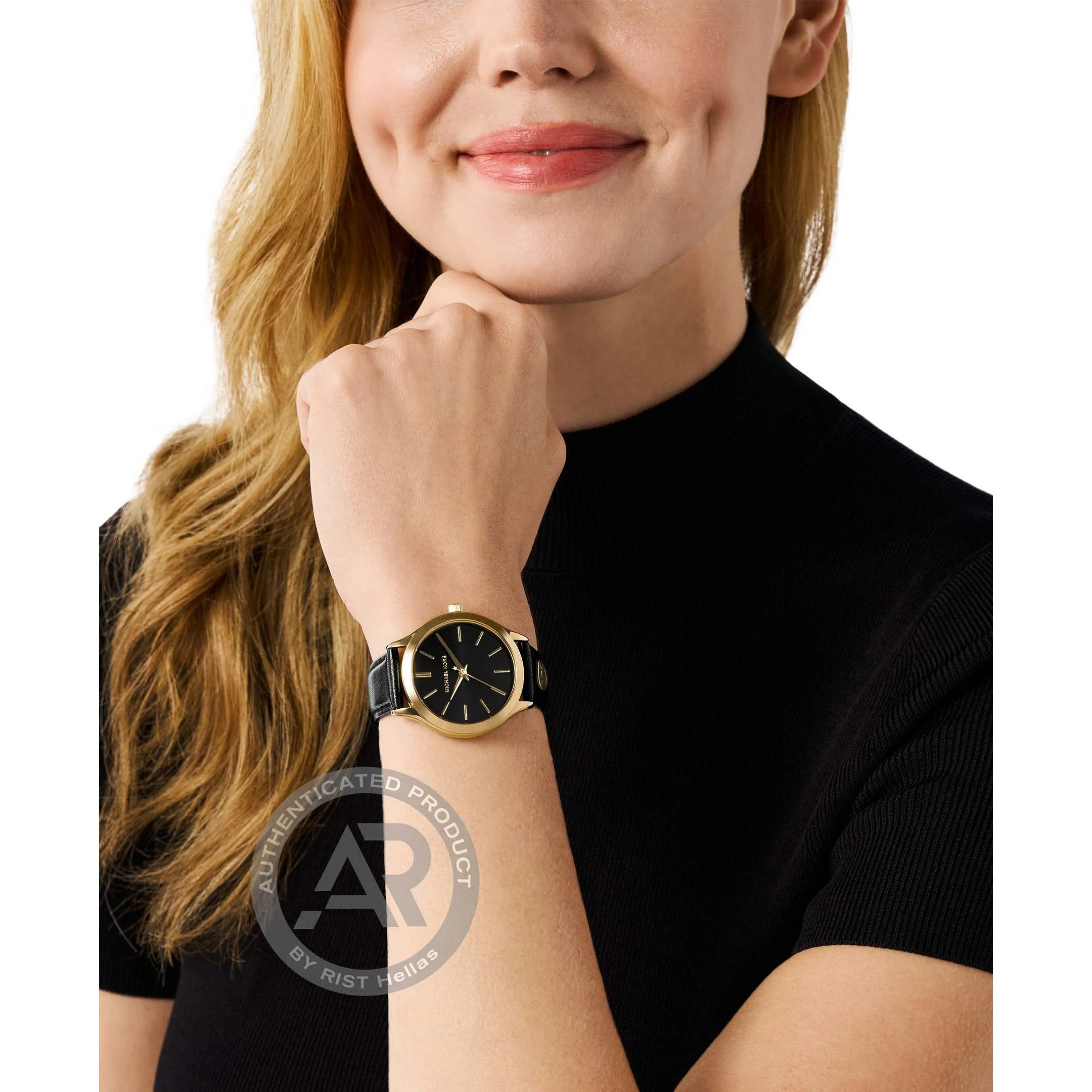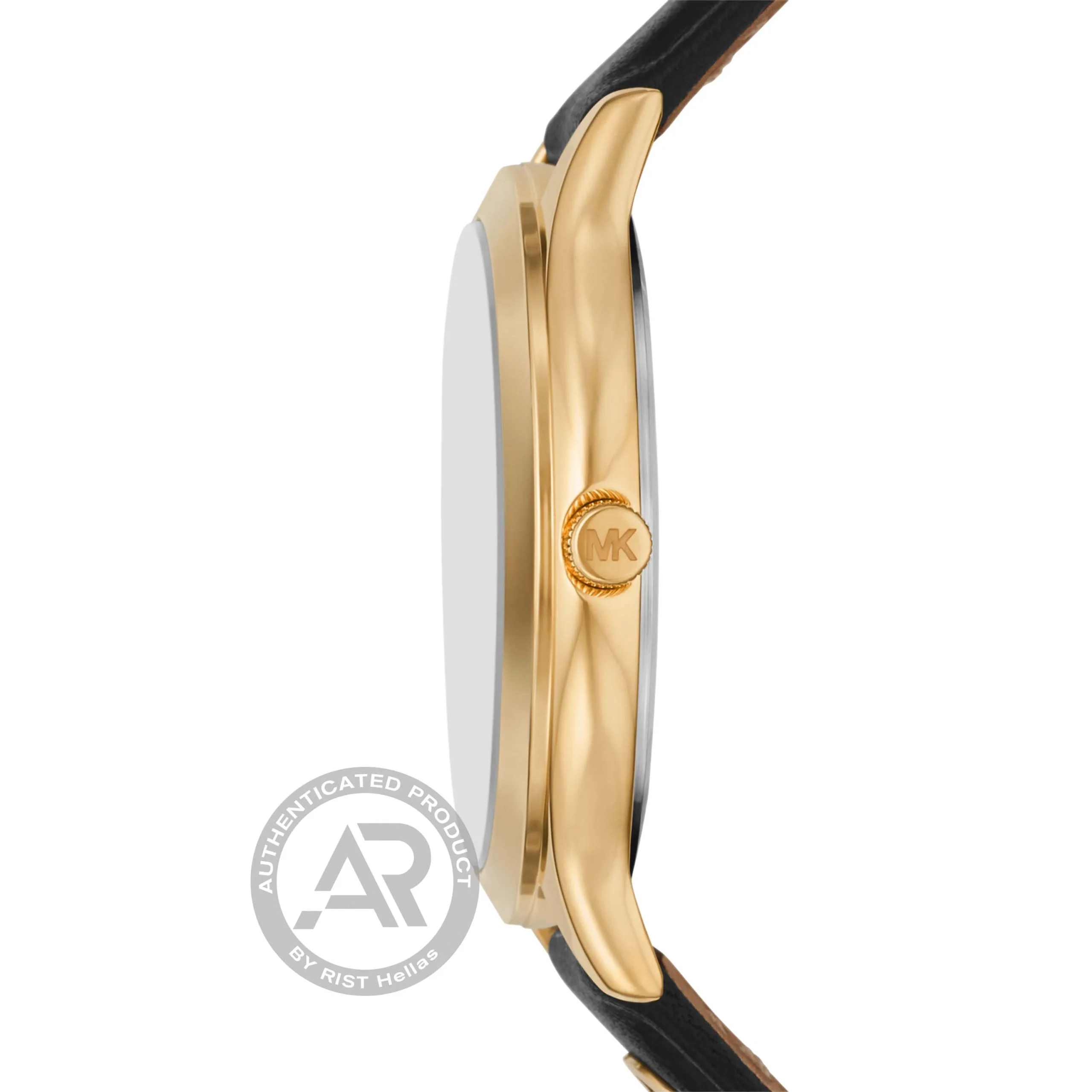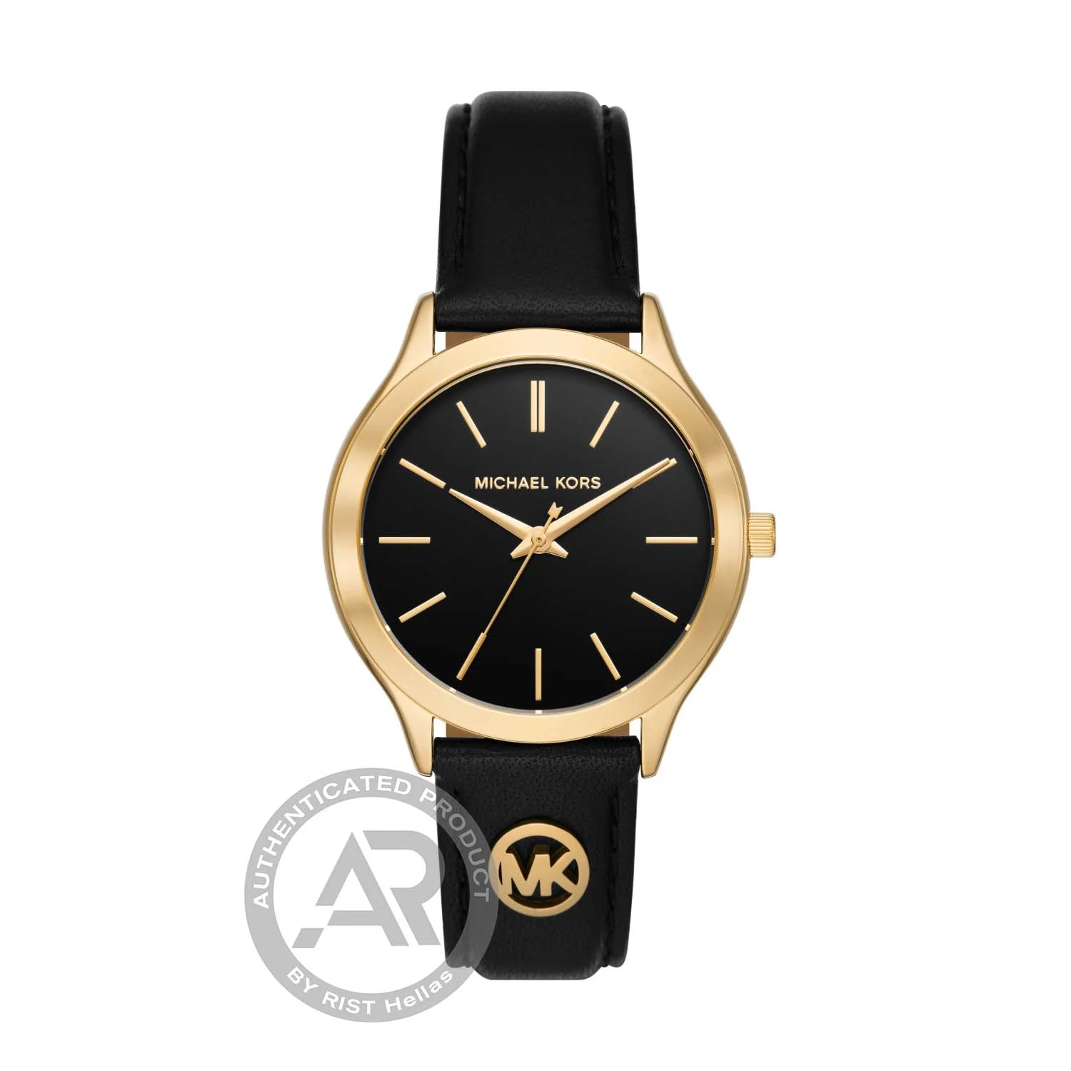 Γυναικείο ρολόι Michael Kors από επίχρυσο ανοξείδωτο ατσάλι με μαύρο καντράν και μαύρο δερμάτινο λουράκι.