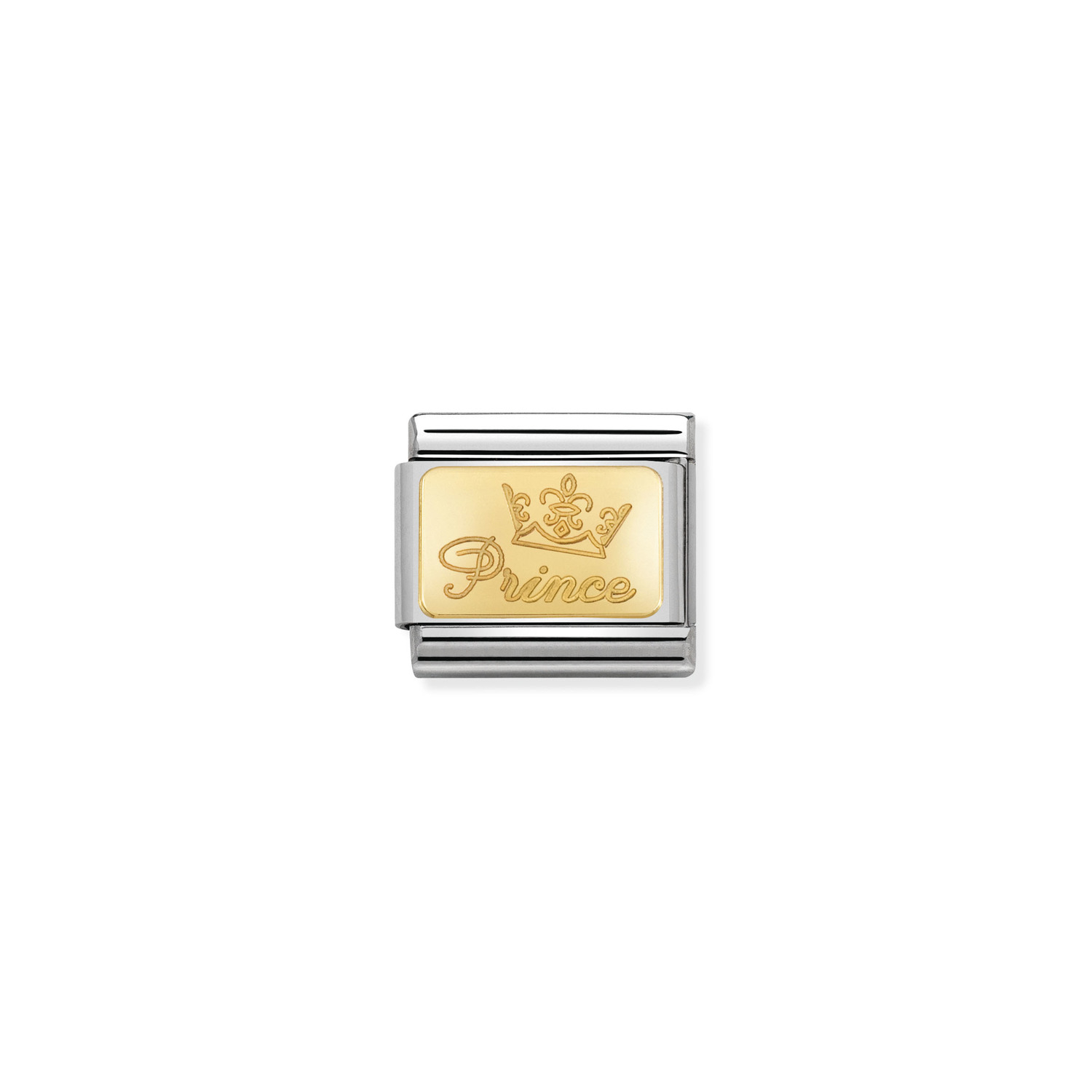Charm for the Original Composable Classic bracelet with “Prince” and a Crown symbol engraved in stainless steel and 18K gold. Made in Italy. Each family has its prince!