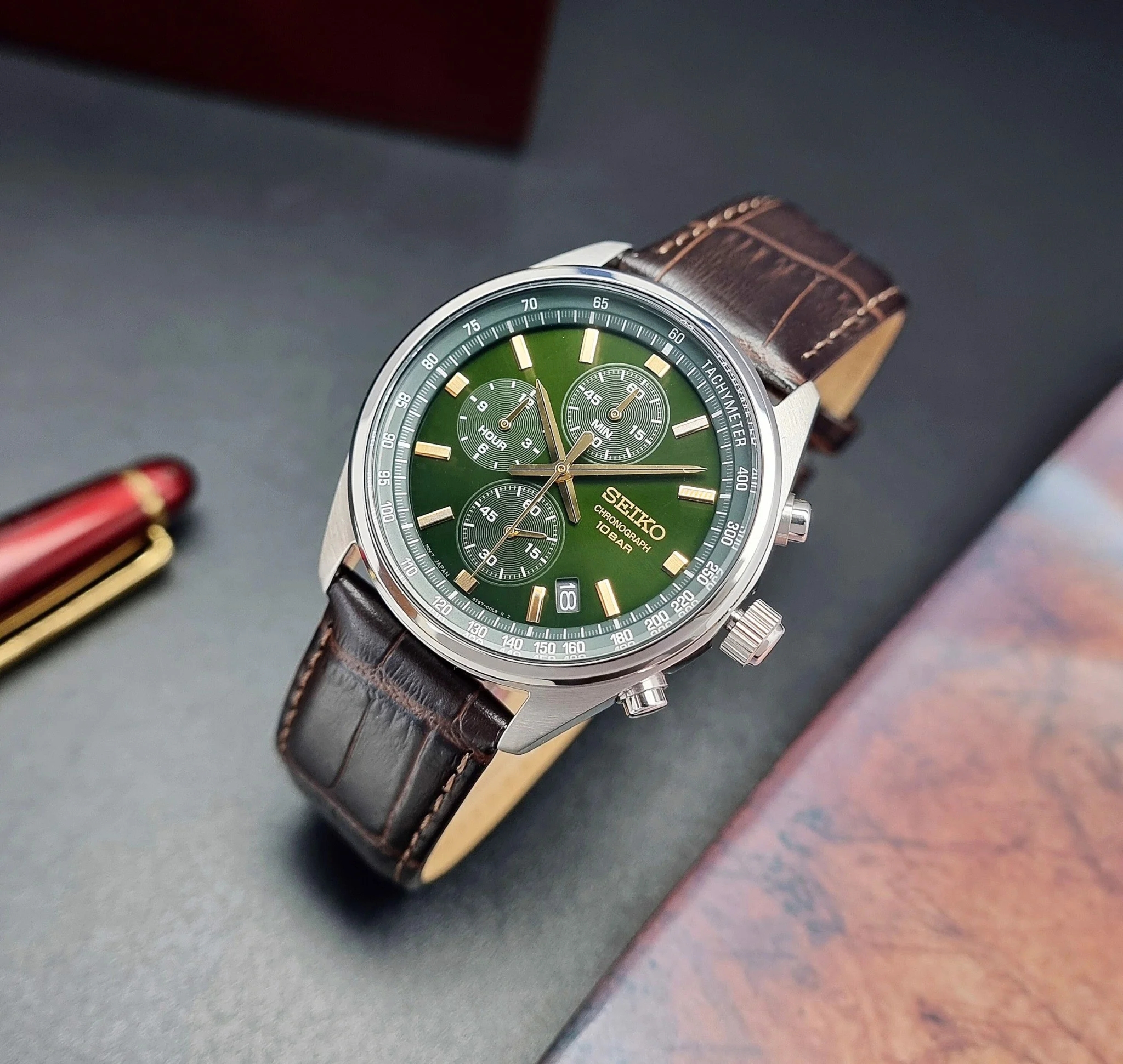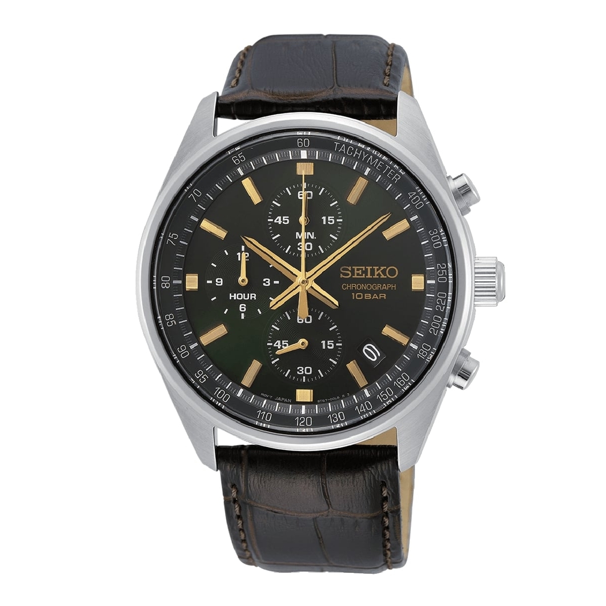 Ανδρικό ρολόι Seiko από ανοξείδωτο ατσάλι με πράσινο καντράν και καφέ δερμάτινο λουράκι.