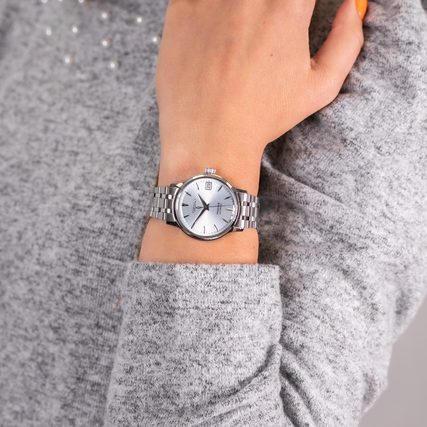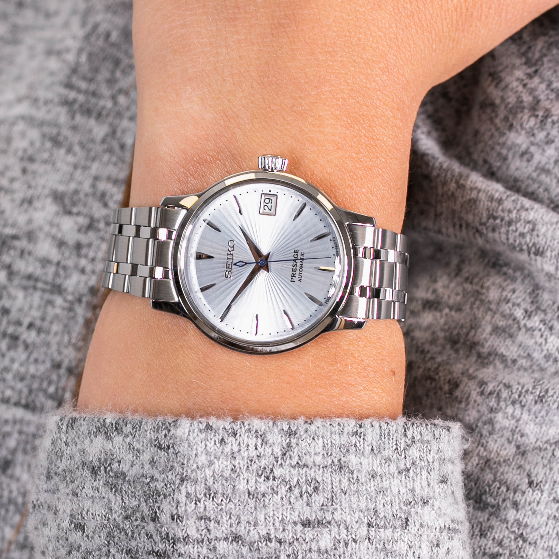 Γυναικείο ρολόι SEIKO Presage, με αυτόματο μηχανισμό από ανοξείδωτο ατσάλι, με ice blue ανάγλυφο καντράν και μπρασελέ.