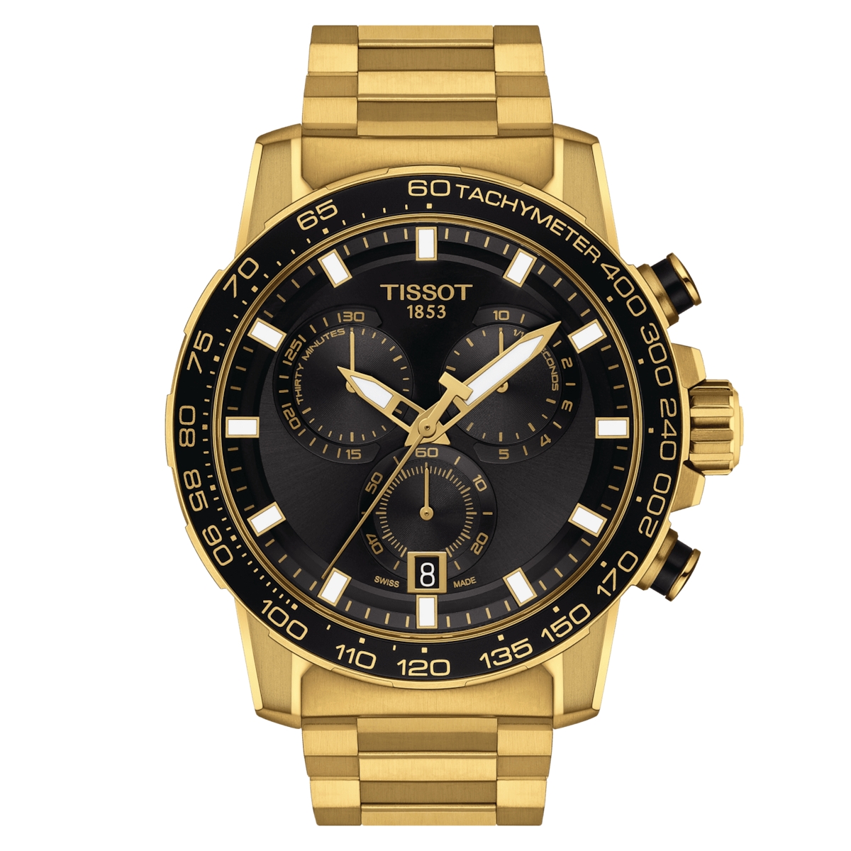 Αυτή η έκδοση του Tissot Supersport Chrono διαθέτει ελβετικό μηχανισμό quartz και κάσα από ανοξείδωτο ατσάλι 316L με επίστρωση PVD κίτρινου χρυσού. Το μαύρο καντράν με την ένδειξη ημερομηνίας έρχεται σε αντίθεση με τους κίτρινους χρυσούς δείκτες και δείκτες ωρών. Το μπρασελέ από ανοξείδωτο ατσάλι 316L, επίσης με επίστρωση PVD κίτρινου χρυσού, διαθέτει σύστημα γρήγορης απελευθέρωσης. Είναι εύκολο να αλλάξετε το λουράκι σας και να αλλάξετε στυλ.